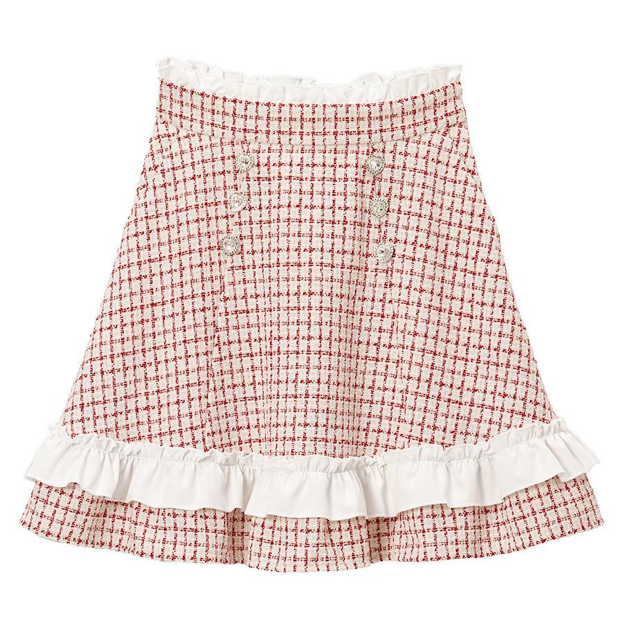 かわいいツイードチェック生地に、無地フリルがポイントのスカート