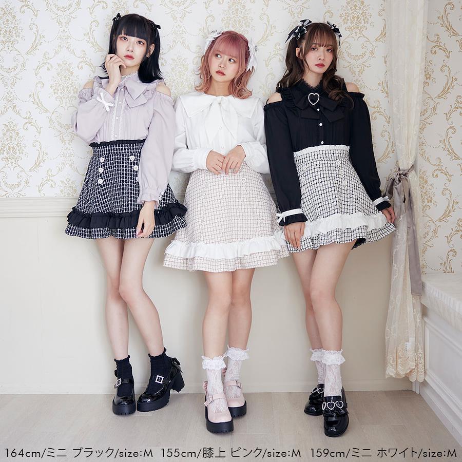 かわいいツイードチェック生地に、無地フリルがポイントのスカート