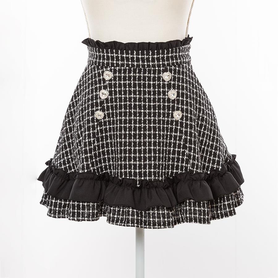 かわいいツイードチェック生地に、無地フリルがポイントのスカート