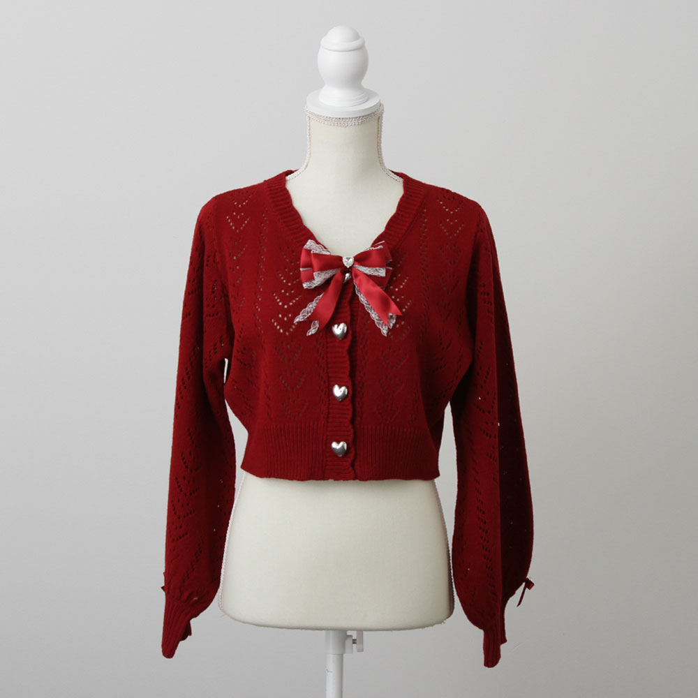 ときめくハート編地のかわいすぎるカーディガンが登場♪【デザイン】かわいいハートの編地の透かしカーディガンです♪ボリューム感のあるサイズ感でショートの丈感がスタイルをよく見せてくれます。カラーもかわいいカラーを沢山ご用意したので参戦服としても活躍してくれます♪前立てにはシルバーハートの立体ハートボタンとキラキラビジューのかわいいリボンがポイント♪コーデのワンポイントにもなるオススメのアイテムです。【素材】透かし編みのニットです。前のボタンで着脱可能です。前立てリボンは取り外しが可能です。【コーディネート】色々なコーデに合わせて着用できる万能カーディガンです。肌寒い季節や室内で羽織りたいときなどに活躍してくれます。ボリューム感があるのでどんなコーデにも羽織って頂けます♪《透け感》ややあり 《生地の厚さ》普通 《裏地》なし 《伸縮性》なし《生産国》中国