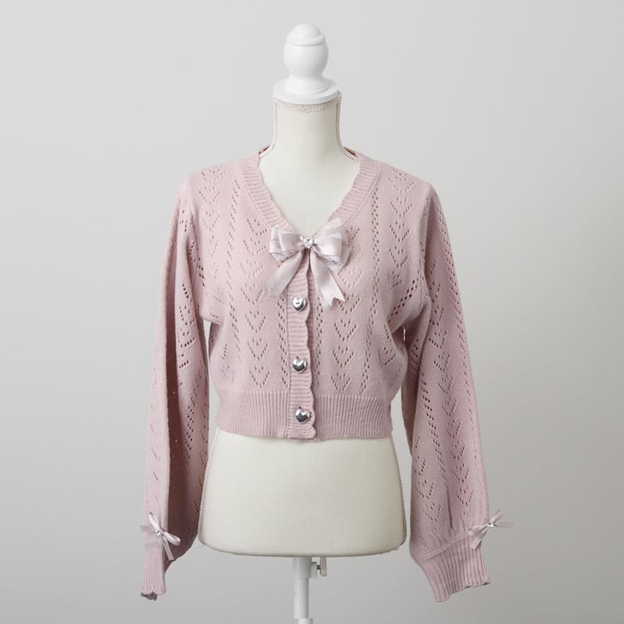 ときめくハート編地のかわいすぎるカーディガンが登場♪【デザイン】かわいいハートの編地の透かしカーディガンです♪ボリューム感のあるサイズ感でショートの丈感がスタイルをよく見せてくれます。カラーもかわいいカラーを沢山ご用意したので参戦服としても活躍してくれます♪前立てにはシルバーハートの立体ハートボタンとキラキラビジューのかわいいリボンがポイント♪コーデのワンポイントにもなるオススメのアイテムです。【素材】透かし編みのニットです。前のボタンで着脱可能です。前立てリボンは取り外しが可能です。【コーディネート】色々なコーデに合わせて着用できる万能カーディガンです。肌寒い季節や室内で羽織りたいときなどに活躍してくれます。ボリューム感があるのでどんなコーデにも羽織って頂けます♪《透け感》ややあり 《生地の厚さ》普通 《裏地》なし 《伸縮性》なし《生産国》中国