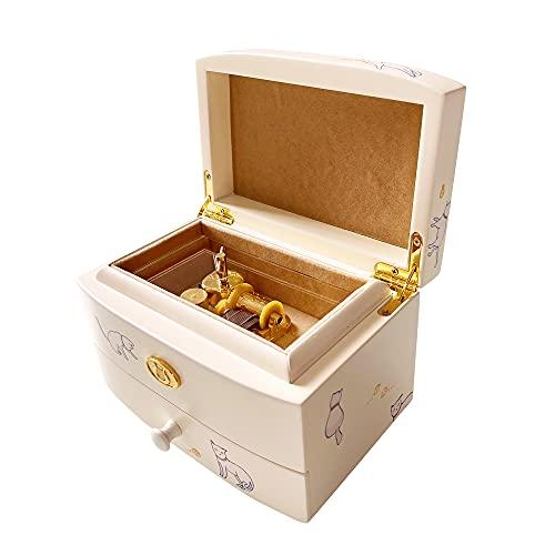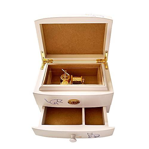 楽曲:<<天空の城ラピュタ>> 材質:ウォールナット 色:クリーム サイズ:W14.5*D10.5*H9cm 仕様:様々な猫ポーズをレーザー印刷を施すことにより可愛さをたっぷりに表現。全体的にはアイボリーを塗装されたが、材質としては豪華家具にもよく使われた銘木のウォールナットです。可愛くてデザインに優れているので、デスクの上に置いてインテリアとしてもお楽しみいただけます。 ラッピング:包装は普通の化粧箱ではなくて、MDFを使った貼箱ラッピングです。