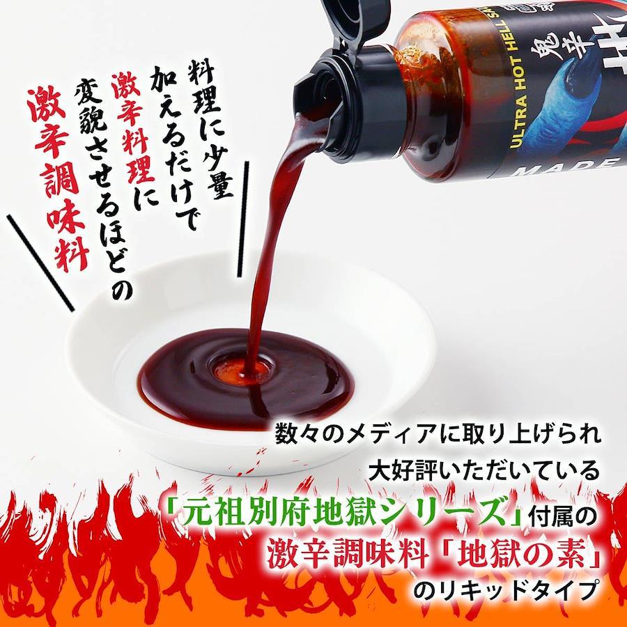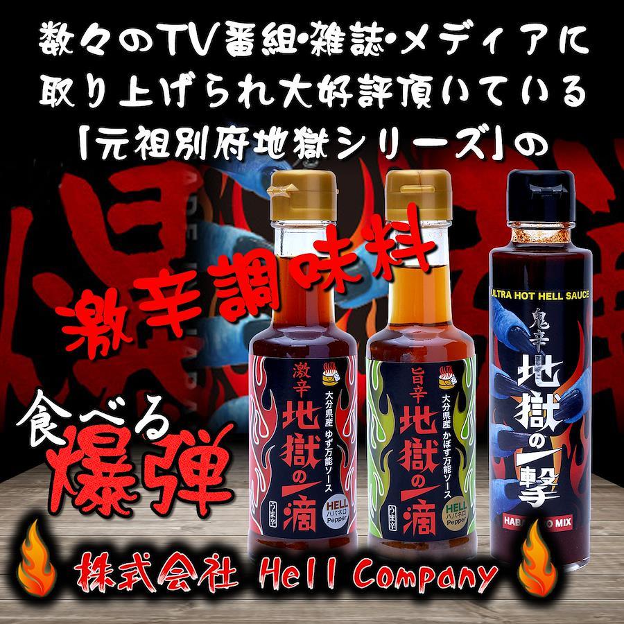数々のTV番組・雑誌・メディアに取り上げられ、大好評頂いている「元祖別府地獄シリーズ」付属の激辛調味料【地獄の素】のリキッドタイプです。