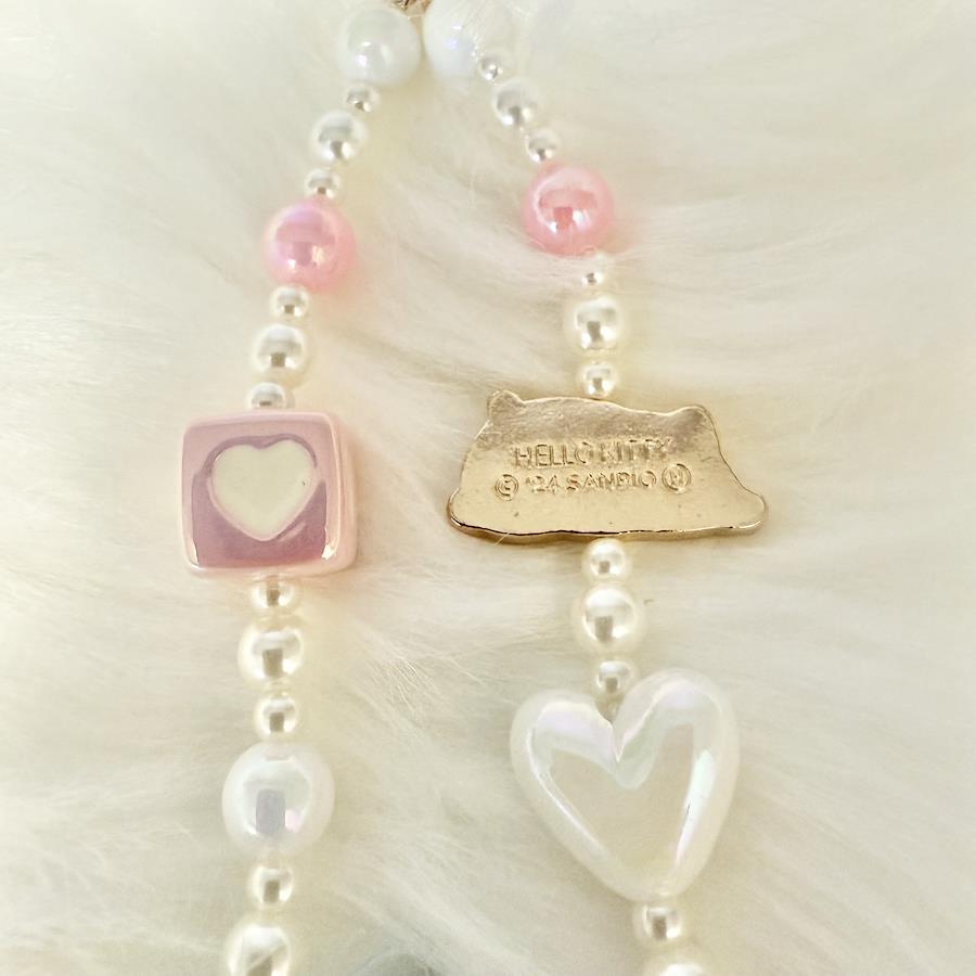 A cute Hello Kitty beaded phone strap featuring pink and white pearls, heart and bow charms, and a sleeping Hello Kitty motif. Perfect for decorating your smartphone, bag, or keychain.Authentic Sanrio item.Condition: Brand New / UnusedApprox. length: 16cm