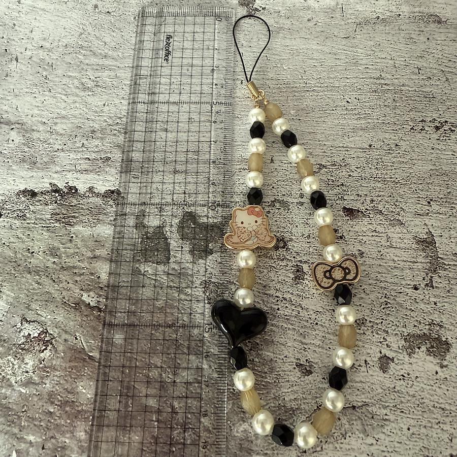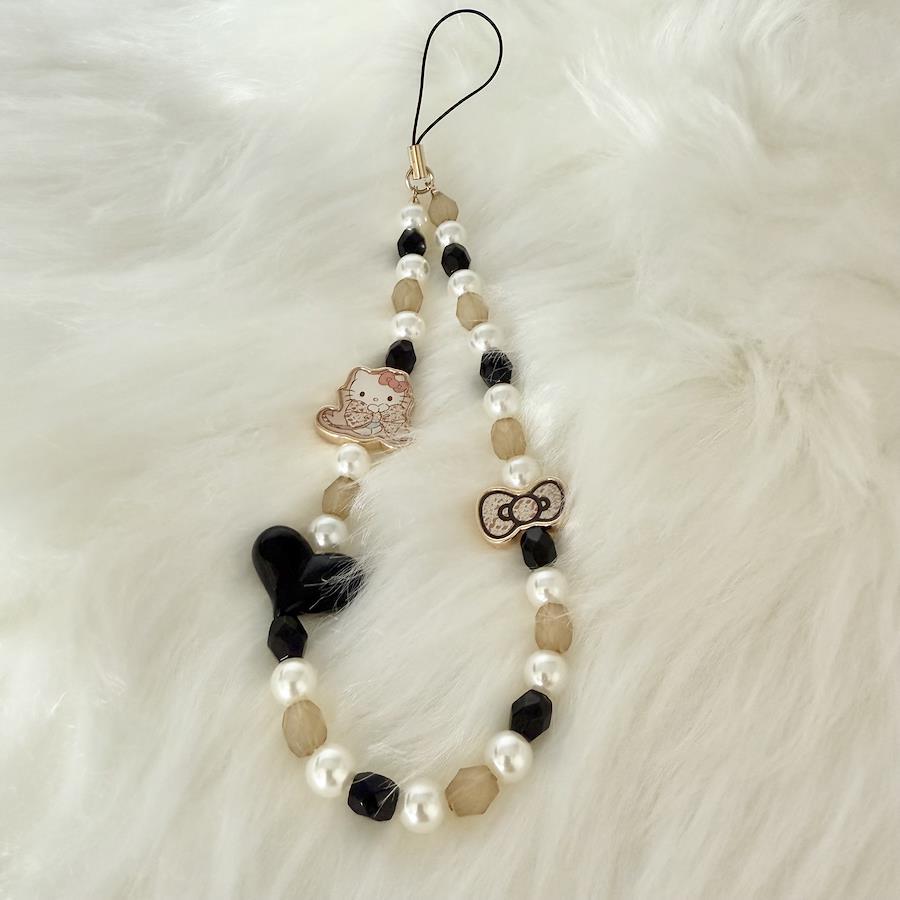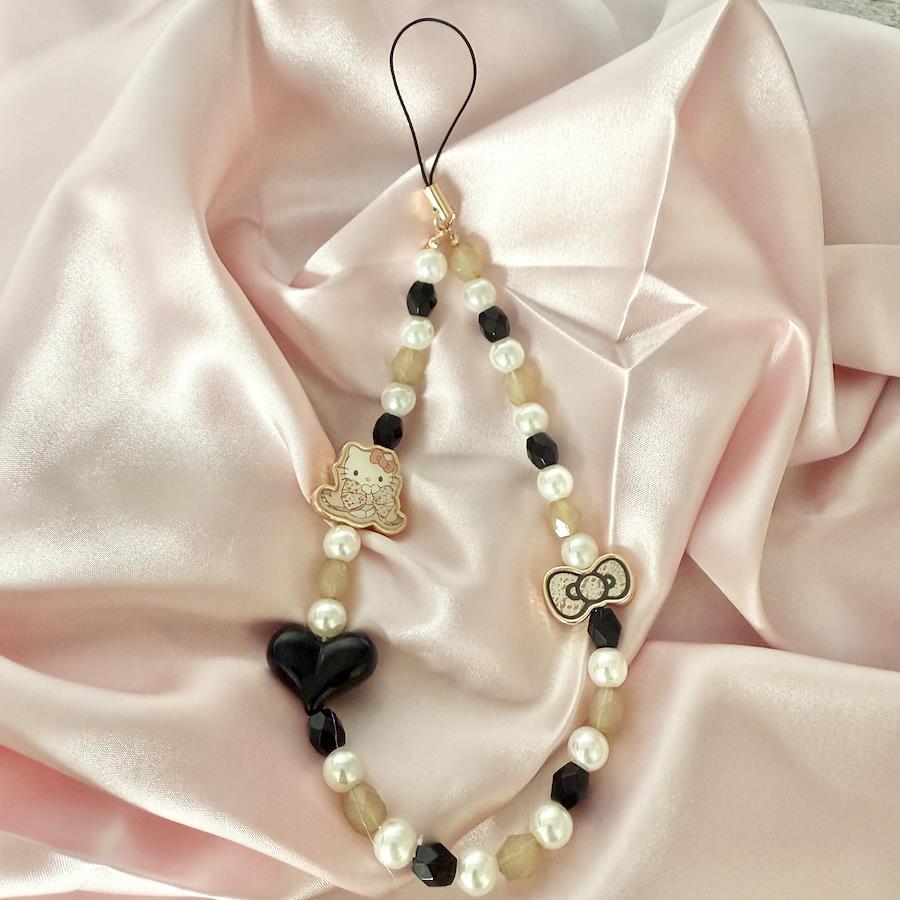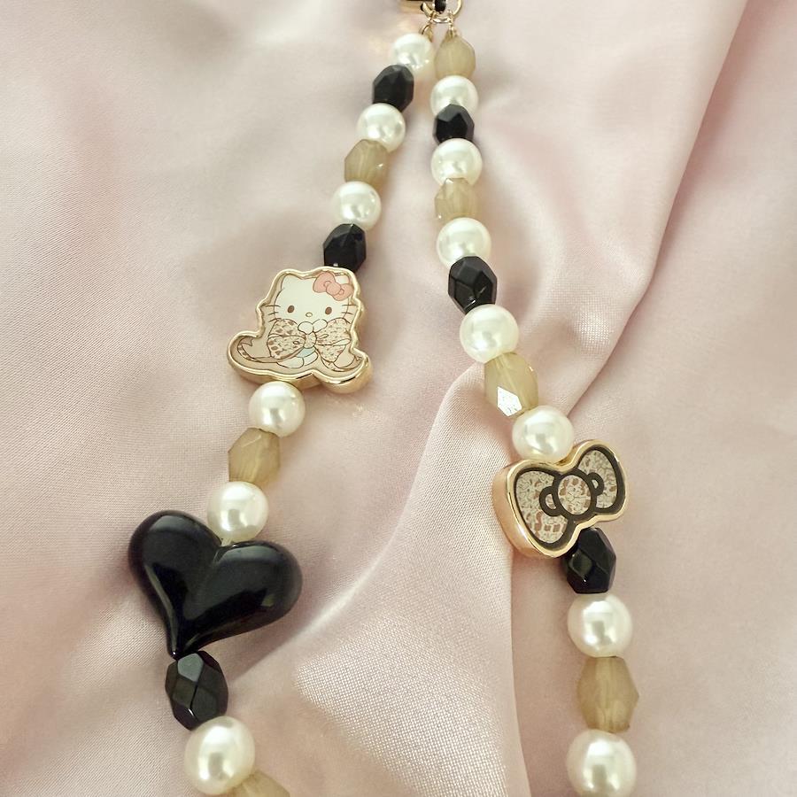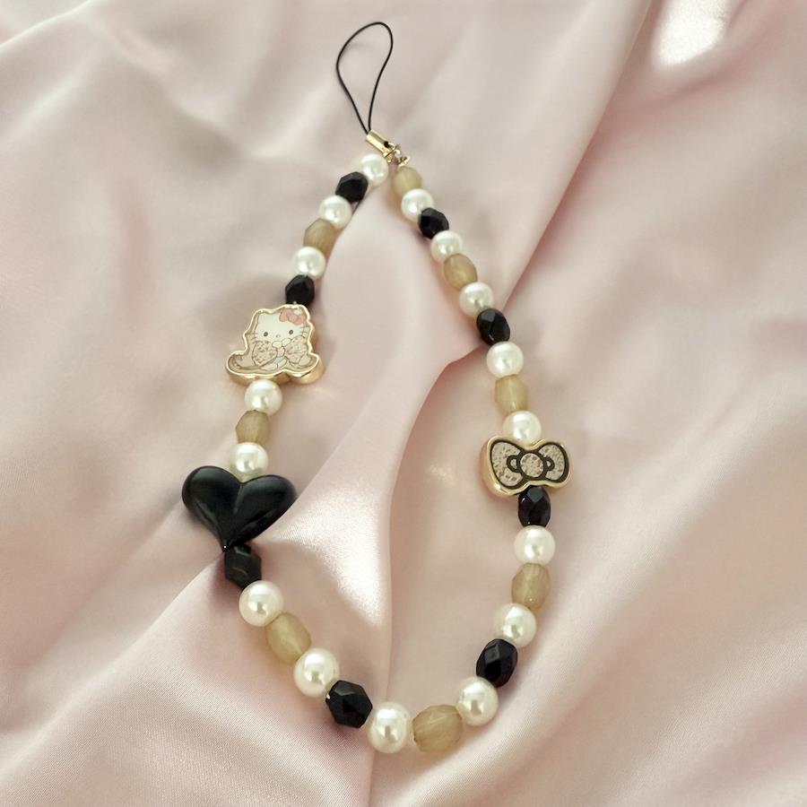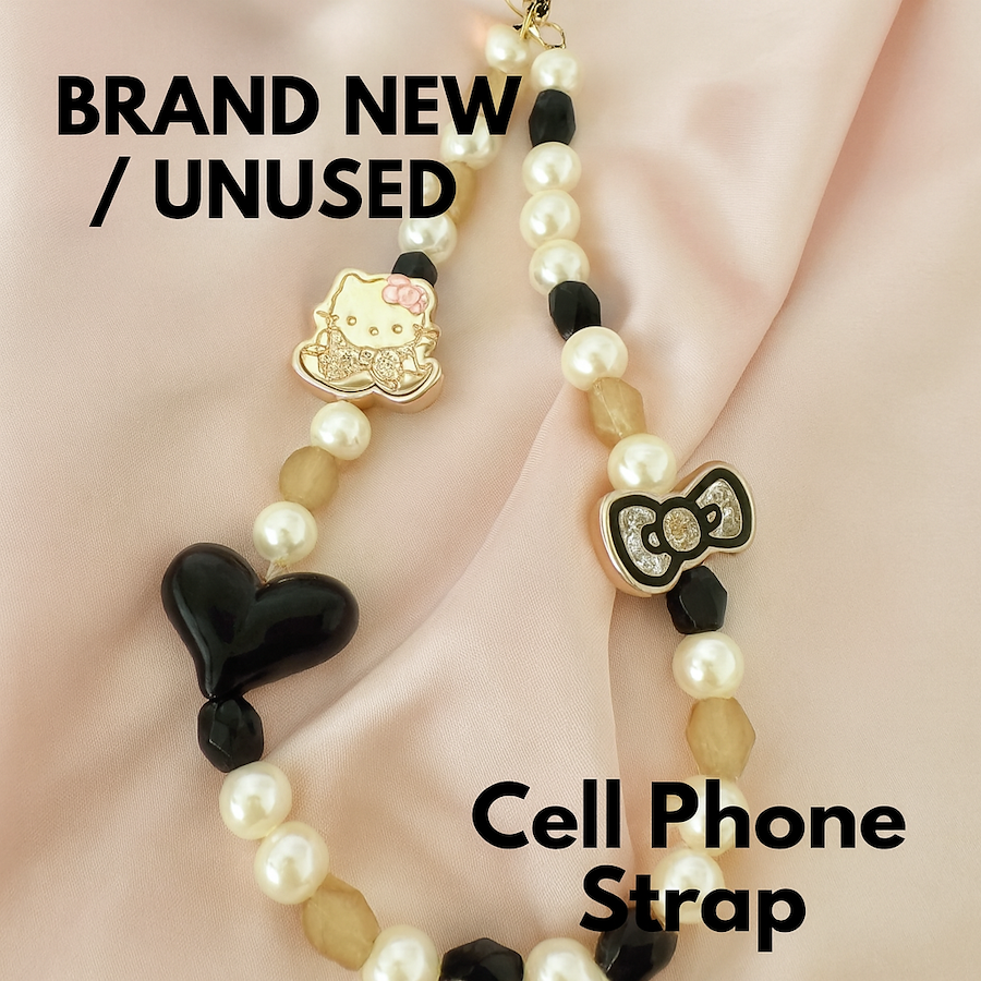 This is a cute Hello Kitty cell phone strap featuring elegant pearls, a black heart charm, and gold-tone accents.Perfect for decorating your smartphone, bag, or keychain.Brand new and unused.