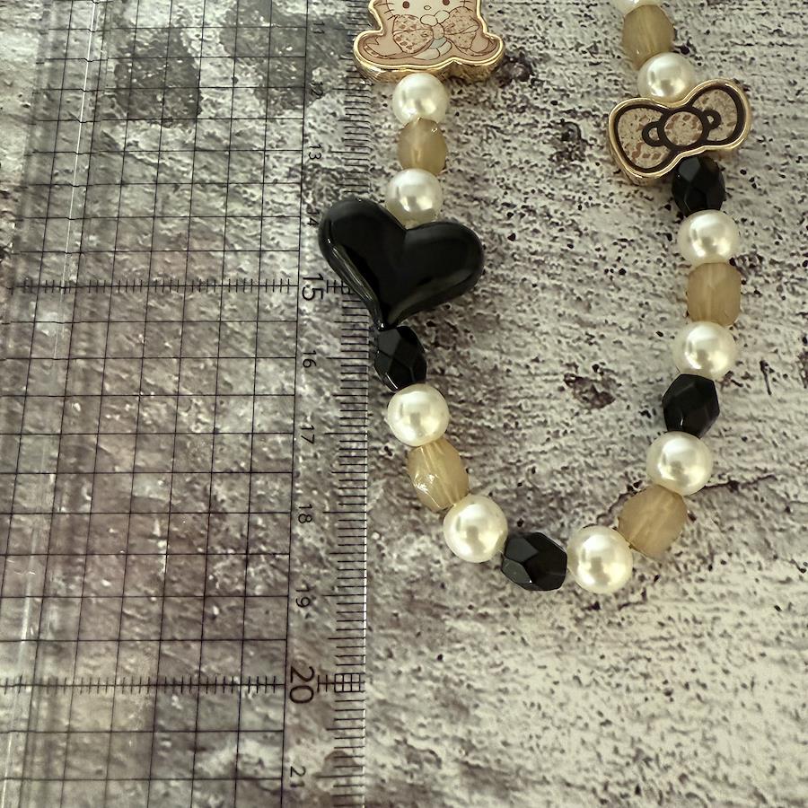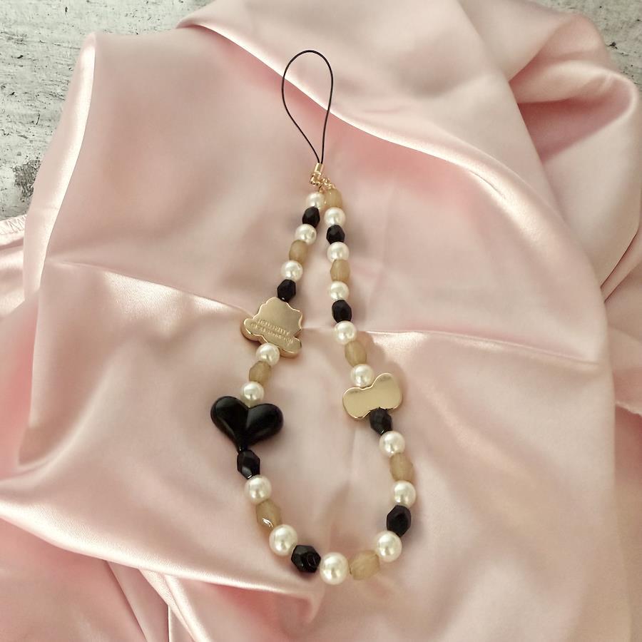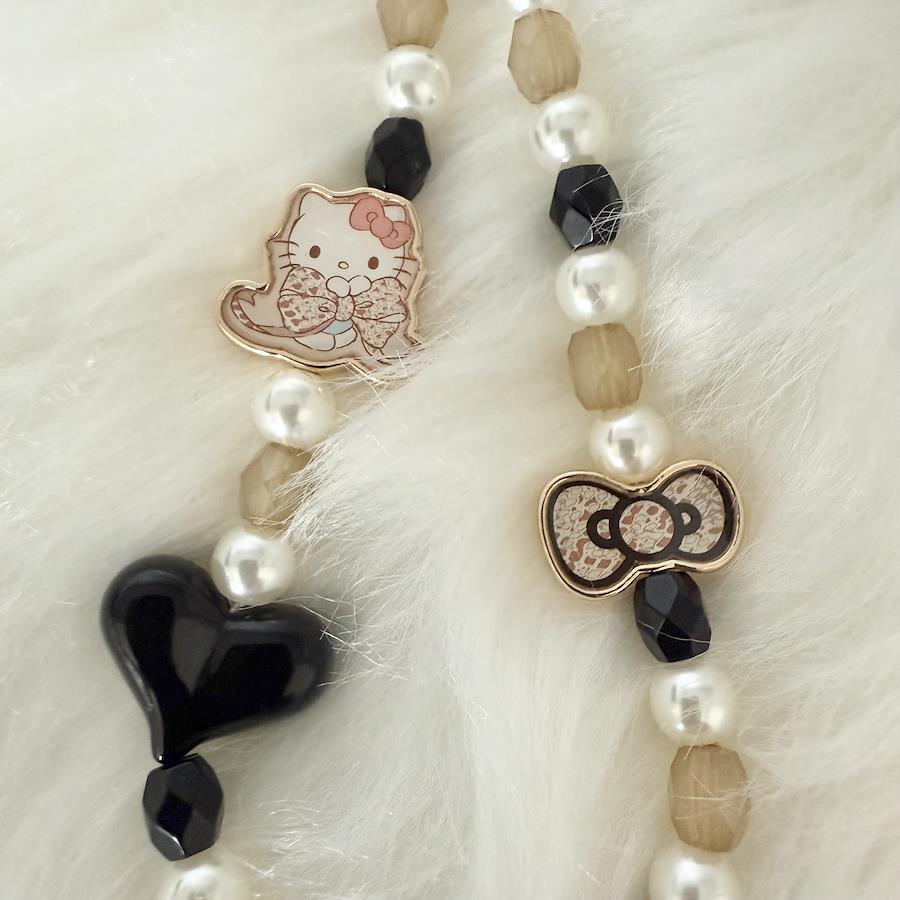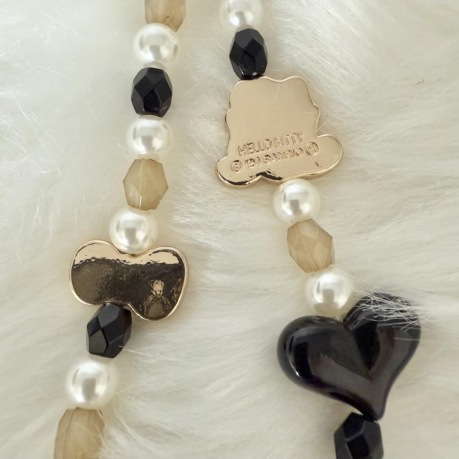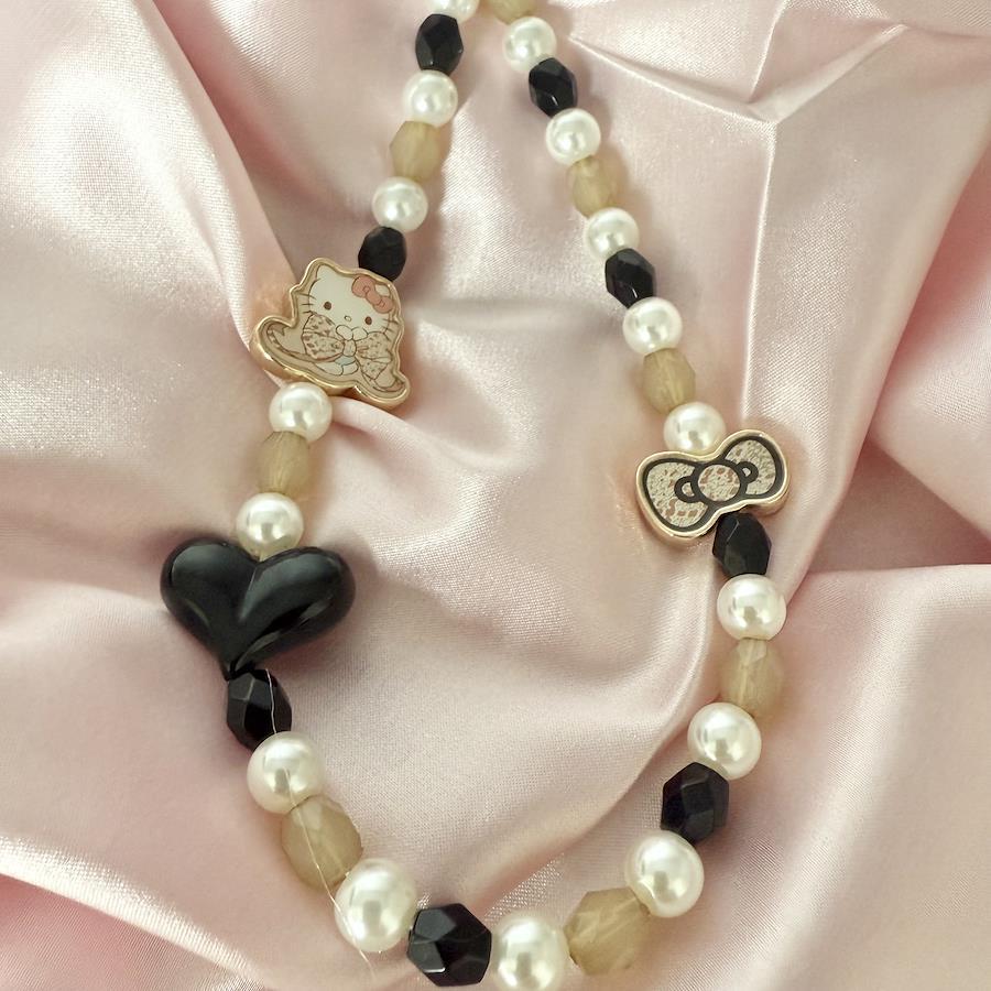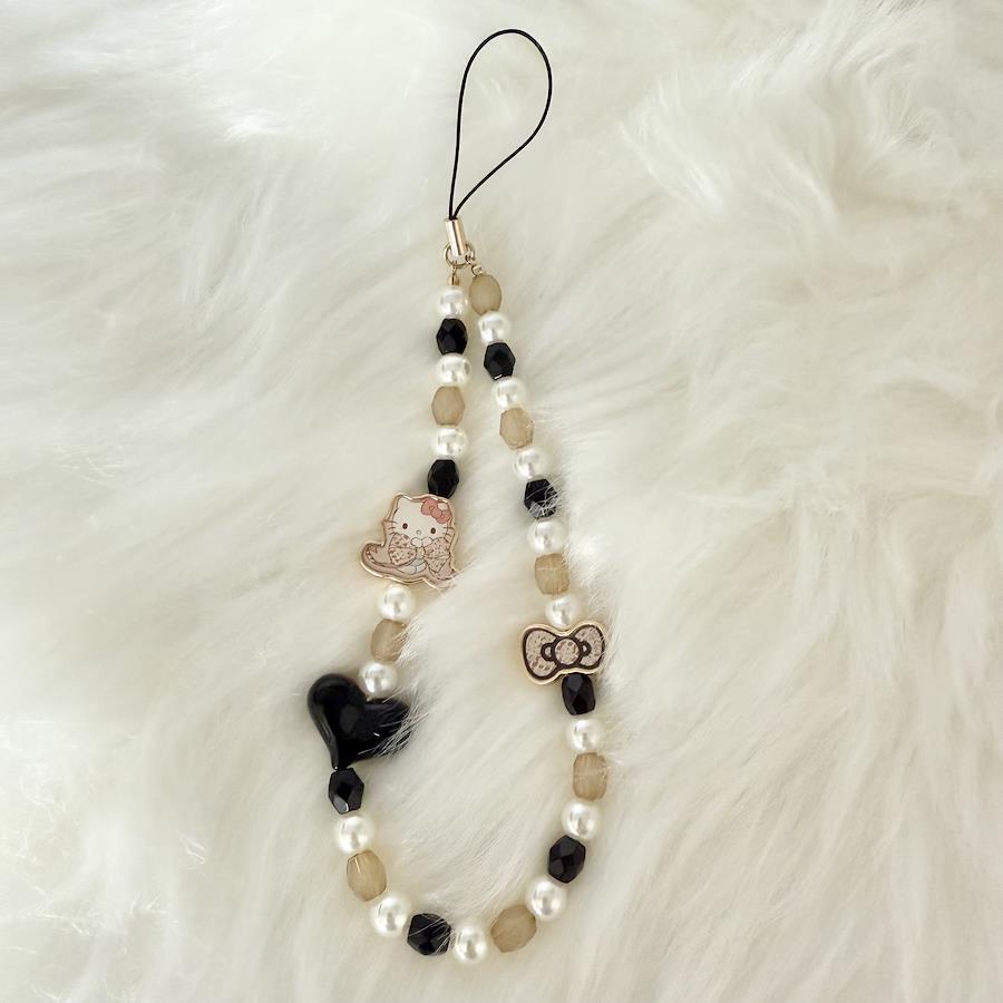 This is a cute Hello Kitty cell phone strap featuring elegant pearls, a black heart charm, and gold-tone accents.Perfect for decorating your smartphone, bag, or keychain.Brand new and unused.