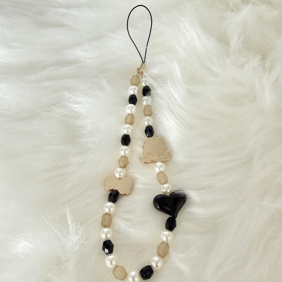 Size: Approx. 20cm (including strap loop)Material: Acrylic beads, alloy metalColor: Gold, black, and pearl whiteCondition: Brand New / Unused