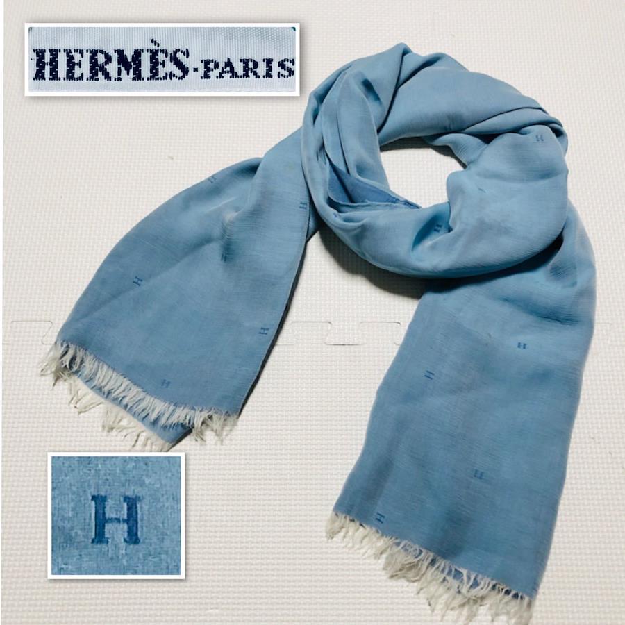 HERMES Large Stole/Scarf, H Pattern, 100% Silk, Made in France, Blue, 166cm x 69cm, Women's