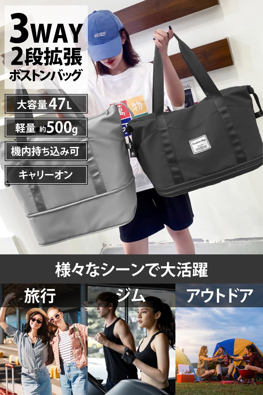 【3WAYボストンバッグ】旅行、ジム、アウトドアなど様々なシーンで活躍できる多機能ボストンバッグ。3WAY(手持ち・ショルダー・キャリーオンバッグ)と自分の使用用途によって使い方を選べるバッグ。使わい時はA4程度に折りたたみが可能で、急に荷物が増え時のサブバッグとしても活躍します 【大容量】容量は約28Lと大容量!1泊の旅行はもちろん2泊分の荷物も収納できる。1泊2日または2泊3日の旅行や子供の修学旅行や林間学校などにちょうど良いサイズとなっています。また底面のファスナーを開くことでサイズを2段階拡張可能(1段拡張:38L、2段拡張時:47L)。お土産を買って帰りの荷物が多くなった時でも拡張することでより多くの荷物を詰め込める。 【豊富な収納ポケット】合計5つの収納(メイン収納・乾湿分離ポケット・小物ポケット・背面ポケット・フロントポケット)がありバックで迷子になりがちな小物類も使いやすく整理整頓。乾湿分離ポケットは防水性のあるポケットで濡れたタオルや洗面用具などを入れることで衣類なのが濡れる心配がなくなります。水泳や海水浴、温泉などに持っていくバッグとしてもおすすめ。 【キャリーオンバッグ】キャリーオンバッグとしてキャリーバッグ、スーツケースに固定可能。バッグ背面にはスーツケース固定用の加工がされており、簡単にスーツケースに設置可能。キャリーケースからズレ落ちる心配がないので、旅行時の移動がもっと楽になる!また機内持ち込み可能なサイズなので、バッグ1つで旅行行く方にもおすすめ。 【撥水加工】耐久性・撥水効果の高い、高密度ナイロンオックスフォード生地を採用しているので急な雨でも大丈夫。生地は上品な光沢があり、傷もつきにくく、シワも出来にくいです。防汚性もあり汚れた場合もお手入れが簡単で、水で手洗い可能です。(洗濯機不可) 【軽量】重量はたったの500gしかないので子どもでも楽々持ち運べる重さです。子供の修学旅行や宿泊学習などにちょうど良いサイズ感です。またシンプルなデザインなので大人でもご利用いただけます。カラーもブラック、グレー、ピンクの3カラー展開で男性から女性まで幅広い方にご利用いただける。