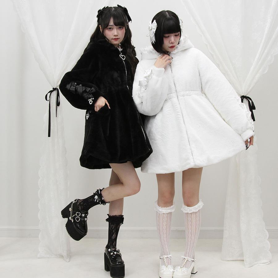 かわいいレースたっぷりのうさみみ付きフードデザインから選べるファーコートです。