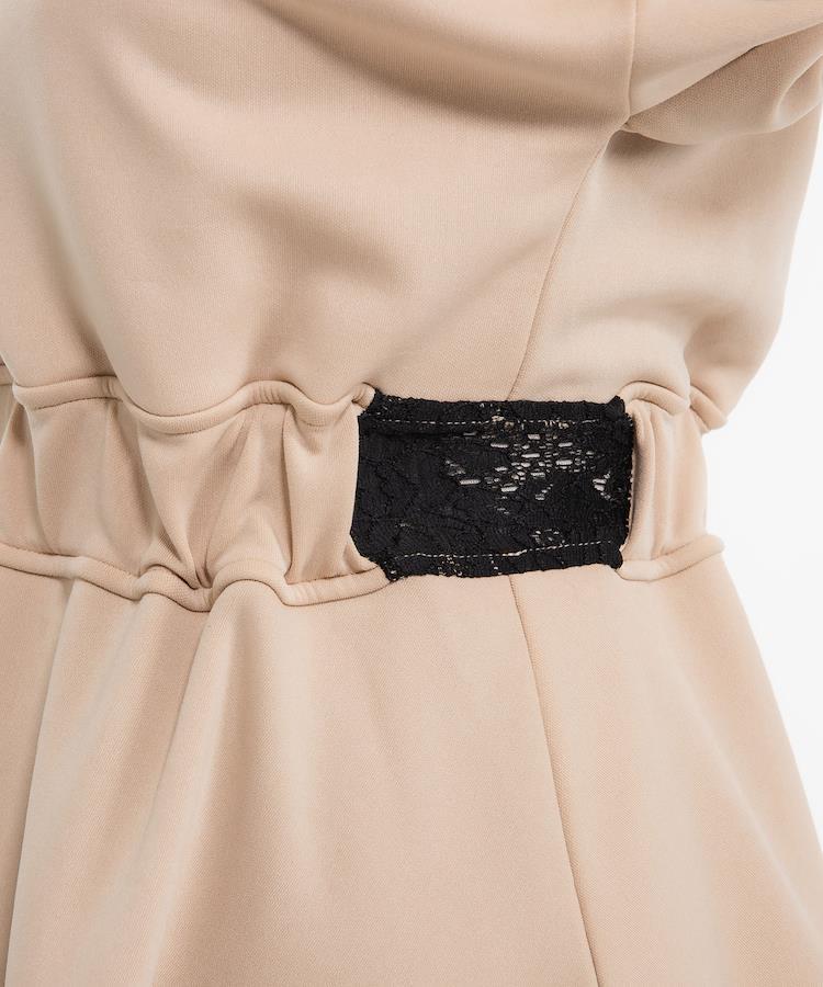 ◆Designフェミニンで華やかなフリルやティアードデザインが加わったワンピースです。フードが付いているため、カジュアル感もあり可愛さも増し増しです。ウエストでキュっと絞れてスタイルアップ。フロントジップのキラキラデザインまで拘りました。脇はレースで肌魅せデザイン。軽やかなポンチ素材で着心地も◎