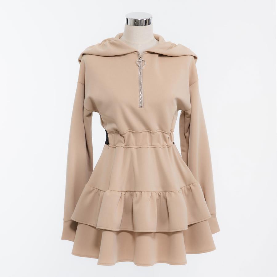 ◆Designフェミニンで華やかなフリルやティアードデザインが加わったワンピースです。フードが付いているため、カジュアル感もあり可愛さも増し増しです。ウエストでキュっと絞れてスタイルアップ。フロントジップのキラキラデザインまで拘りました。脇はレースで肌魅せデザイン。軽やかなポンチ素材で着心地も◎
