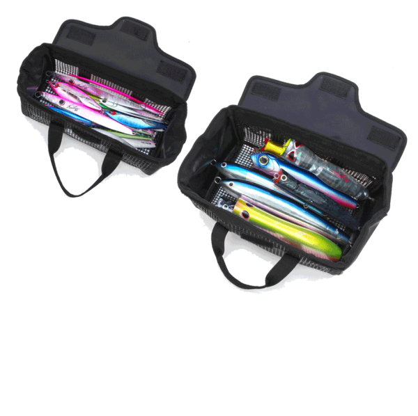 前面・背面・底面の三面がメッシュ素材なので使用後にルアーを入れたまま丸洗いできるPVC製のルアーメッシュバッグです。 3サイズ展開なのでショート・スロージグからロングジグやビッグプラグにも対応します。蓋の上部にはターゲットであるGT、マグロ、カンパチ、ヒラマサのイラストをデザインしました。