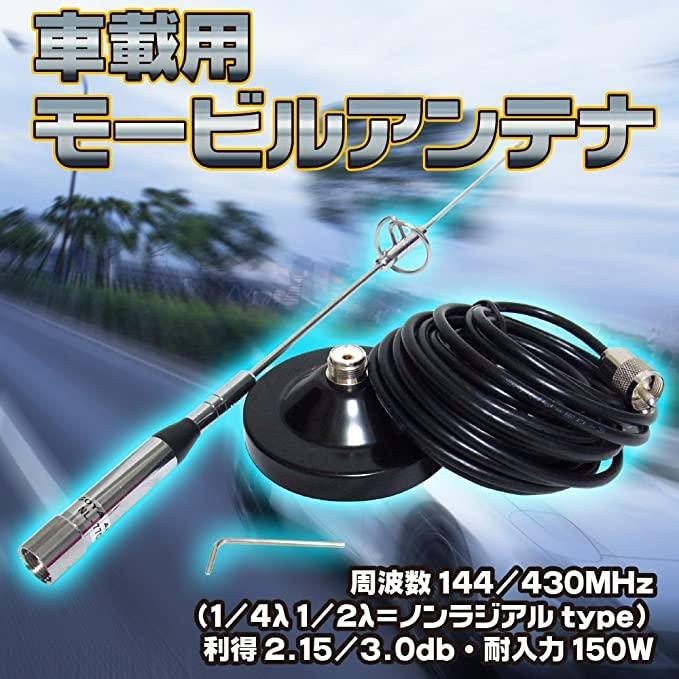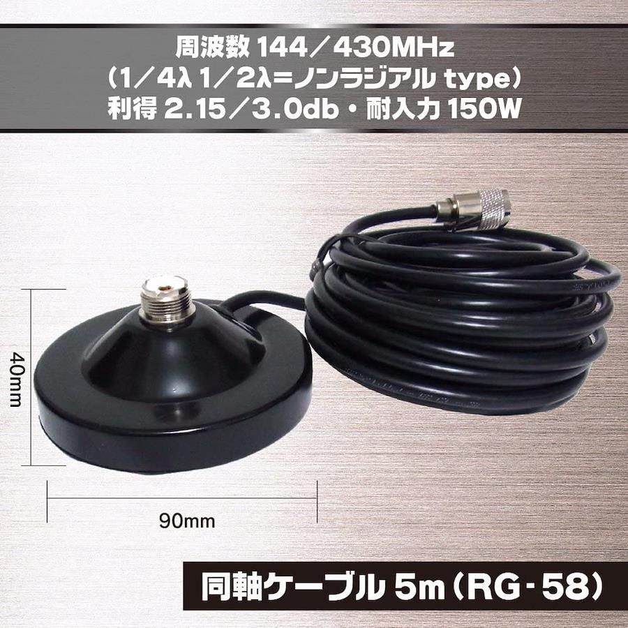 【周波数】 144/430MHz(1/4λ 1/2λ=ノンラジアルtype) 【利得】 2.15/3.0db 【耐入力】 150W【VSWR】 1.5以下 【アンテナ】長さ 415mm 重さ 175g 【インピーダンス】 50Ω・接栓 M型M型接栓 144/430MHz モービルアンテナ マグネット基台 同軸ケーブル 3点セットマグネット基台】 直径 90mm重さ 600g・同軸ケーブル 5m ・接栓 MJ-MP