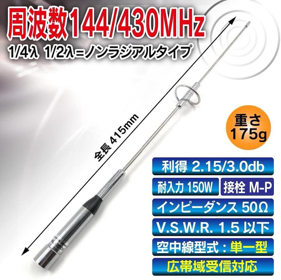 【周波数】 144/430MHz(1/4λ 1/2λ=ノンラジアルtype) 【利得】 2.15/3.0db 【耐入力】 150W ・【VSWR】 1.5以下 【アンテナ】長さ 415mm 重さ 175g 【インピーダンス】 50Ω・接栓 M型 ・M型接栓 144/430MHz モービルアンテナ マグネット