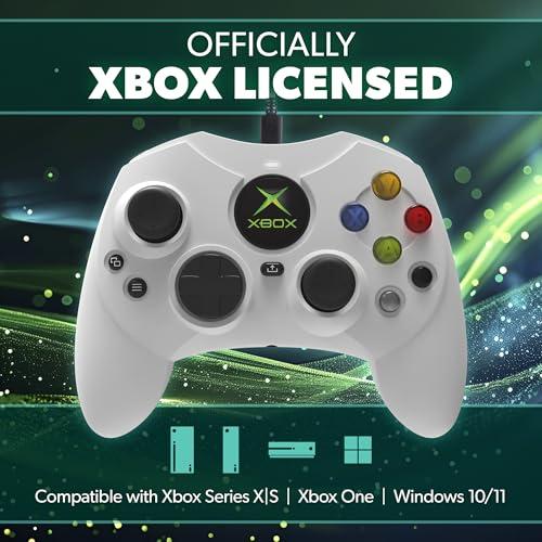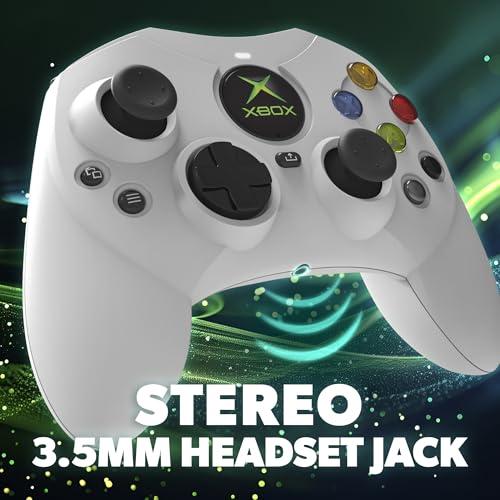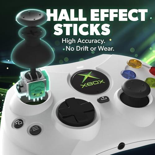 公式ライセンスを持ってオリジナルXboxコントローラSの形、現代のXboxやPC対応コントローラ ドリフトしないホール効果(磁気センサー)アナログスティック インパルストリガー(トリガーに触れる左右の指先それぞれに振動) 白と黒のショルダーボタンを追加