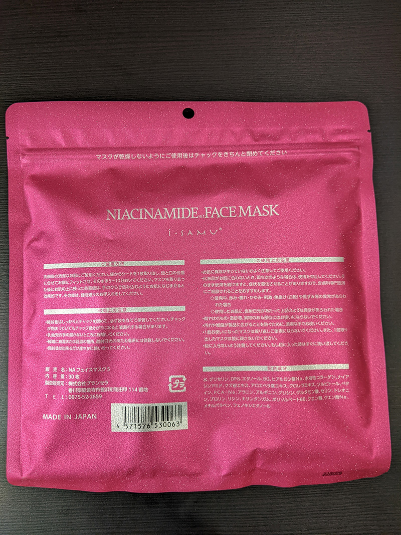 ★目的に合わせて選べる国産フェイスマスク!*愛媛県の工場で製造しており、確かな品質の日本製フェイスマスクです。*350mlの美容液にしっかり浸した厚手のフェイスマスクがお肌に美容成分を肌の隅々まで浸透させます。◇CBD配合:過剰な皮脂の分泌を防ぎ、より効果的なニキビ予防が期待できます。◇VC-100(高濃度ビタミンC誘導体配合):ニキビのもと皮脂を抑制シミの予防、毛穴がある肌の引き締めハリ・シワ対策のサポートが期待できます。◇ナイアシンアミド配合:紫外線ダメージの修復、メラニン生成の抑制・肌荒れの抑制が期待できます。