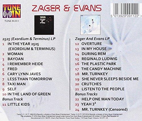 Digitally remastered collection. Zager & Evans was the duo of US folk-rockers Denny Zager and Rick Evans. They are fondly remembered for their classic 1969 single, 'In The Year 2525', a prophetic forewarning of technology taking over humanity in centuries to come. 'In The Year 2525' was # 1 on both sides of the Atlantic in July 1969, in the aftermath of the hit movies Planet Of The Apes and 2001: A Space Odyssey - and as all things futuristic were in the news as Neil Armstrong walked on the moon. The single is one of the best-loved in pop history, having been covered more than 60 times in seven different languages. This 24-track CD features 2525 (Exordium And Terminus), the US hit LP that spawned the single, and it's follow-up Zager & Evans, released in 1969 and 1970, respectively. Also featured are four non-LP bonus tracks, including the 'censored' version of the duo's controversial follow-up single 'Mr. Turnkey'.