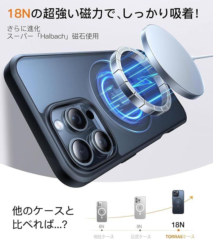 「18Nの超磁力。」内部には360度全周一体型「Halbach」磁石が埋め込まれており、公式ケースよりも強力な磁力を実現する。MagSafe対応アクセサリーがケースにしっかり吸着し、落ちるご心配は無用。充電とスタンドの両立が可能です。