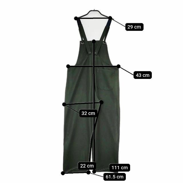 | 実寸サイズ | 着丈:約111cm 身幅:約43cm 股下:約61.5cm ワタリ幅:約32cm 裾幅:約22cm 備考 肩紐は調節可能 ※採寸画像がある商品はハンガーに吊るした状態での計測のため、平置きでの採寸とは差が生じる場合がございます。平置きでの実寸サイズをご希望の場合は、ご購入前に必ずご質問ください。 ※記載以外のサイズが合わないことを理由とした返品はできませんので、 記載部分以外で実寸サイズの気になる箇所があれば必ず購入前にご質問ください。 |