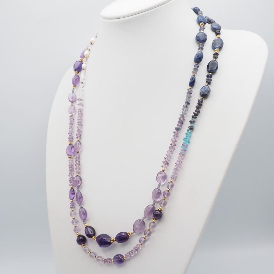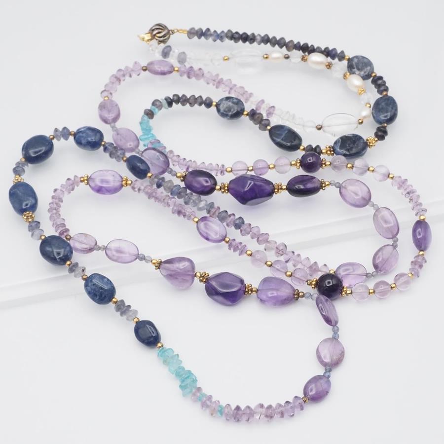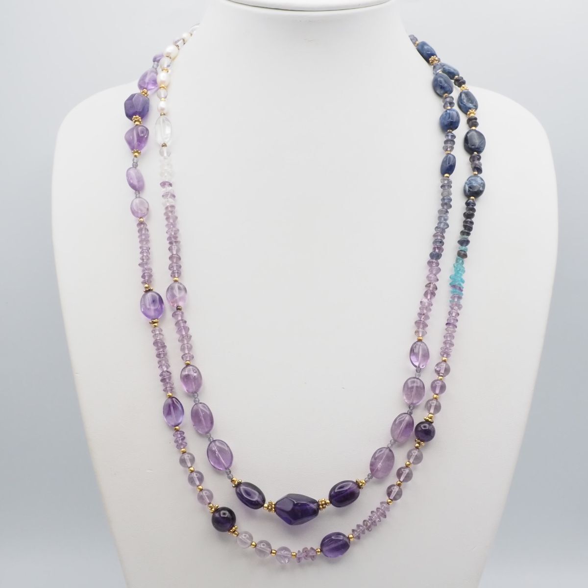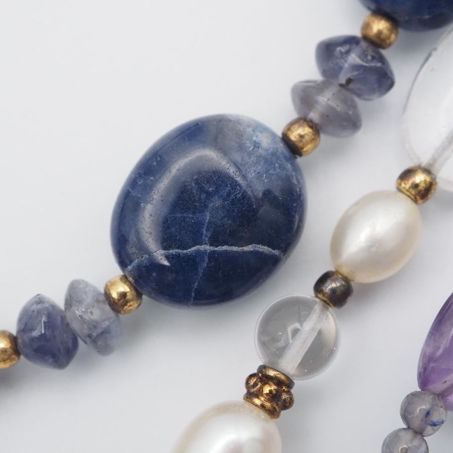 J234 Amethyst, Sodalite, Freshwater Pearl, and Quartz Long Necklace with Silver Stamp, Gold Design, and Silver Stamp, February and June Birthstones