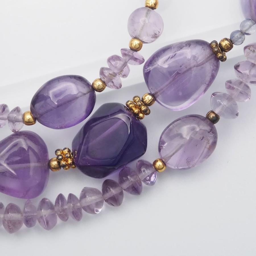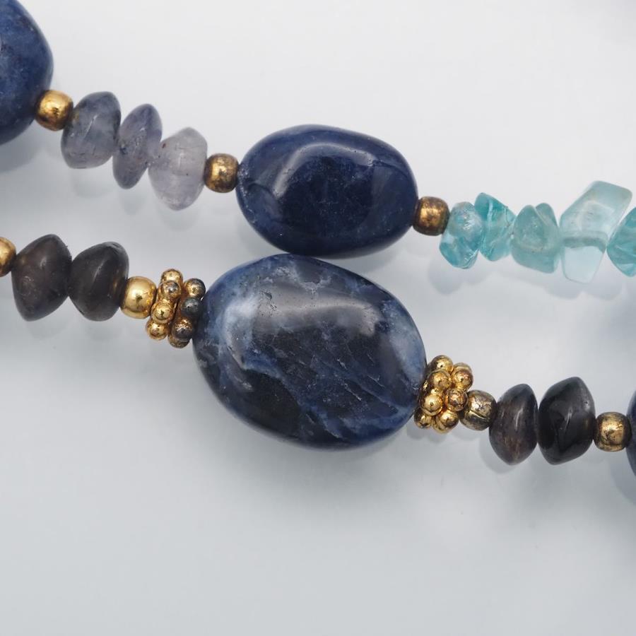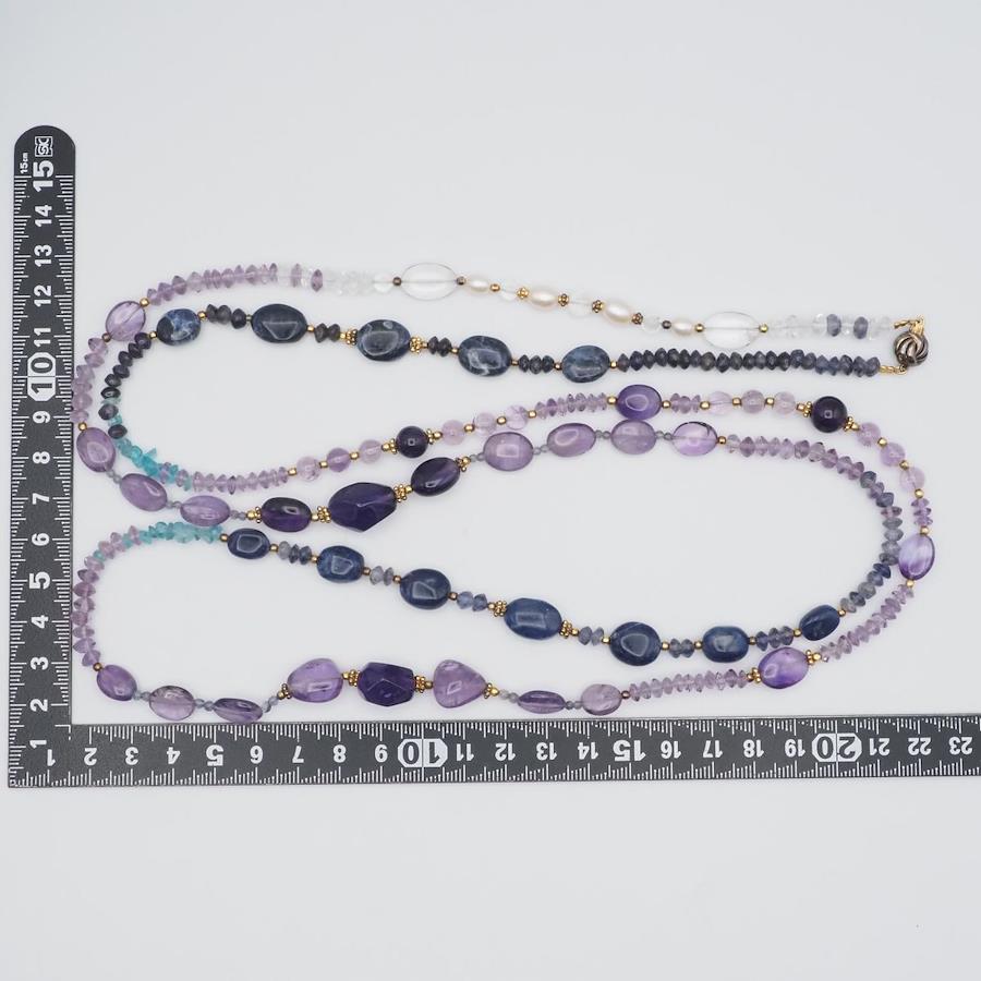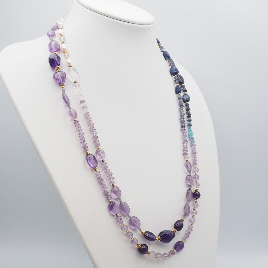 J234 Amethyst, Sodalite, Freshwater Pearl, and Quartz Long Necklace with Silver Stamp, Gold Design, and Silver Stamp, February and June Birthstones
