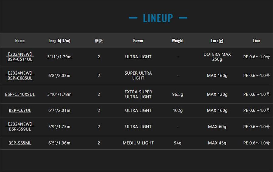 全長:5.9フィート (1.75m) / 継数:2本(グリップジョイント) / 仕舞寸法:132.5cm適合ルアーサイズ:MAX 60g (キャスティング時) / 適合PEライン: 0.6号~1.0号パワー: ウルトラライト(UL) / スピニングリール対応 / コルクグリップ採用ティップ:超高感度 オールチューブラ仕様 (マーキングティップ採用) / ブランク素材: [東レ(株) ナノアロイ テクノロジー適用樹脂]&[カーボン素材 TORAYCA T1100G]品番:【BSP-S59UL】……ベイトモデル並みの感度と送り掛け性能を実現!! 喰い渋りを攻略する送り掛けショートスピンモデル。