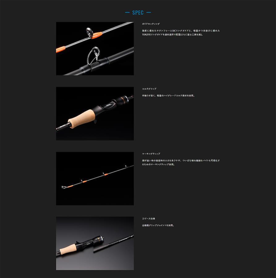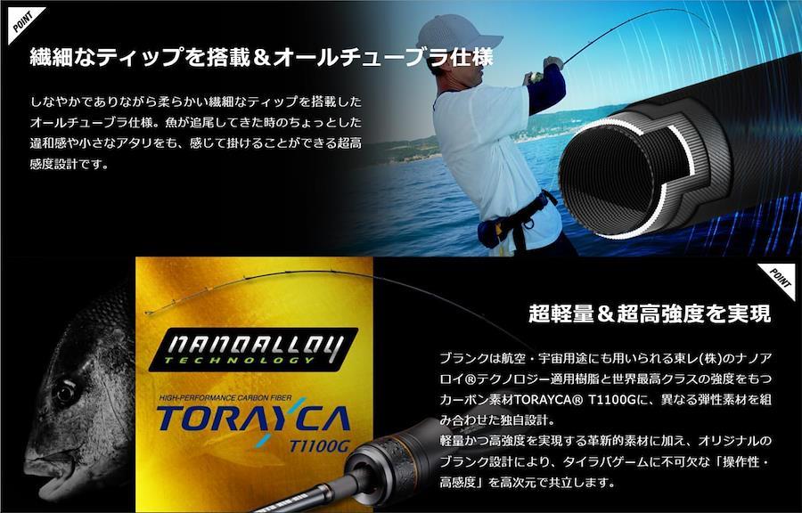 【軽量・高強度を実現する革新的素材】&【オリジナルのブランク設計】により、タイラバゲームに不可欠な【操作性・高感度】を高次元で共立します。しなやかでありながら柔らかい繊細なティップを搭載した【オールチューブラ仕様】。魚が追尾してきた時のちょっとした違和感や小さなアタリをも、感じて掛けることができる超高感度設計です。強度に優れたチタンフレームSiCリングガイドと、軽量かつ糸抜けに優れたTORZITEリングガイドを適材適所で配置。手触りが良く、軽量のハイグレードコルク素材を採用。潮が速い時の着底時の小さな糸フケや、ついばむ様な繊細なバイトも可視化するためのマーキングティップ採用。全機種グリップジョイントを採用。