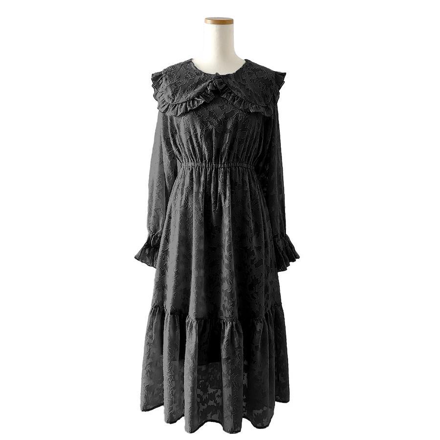 大きめなフリル襟が愛らしいジャガードワンピース。