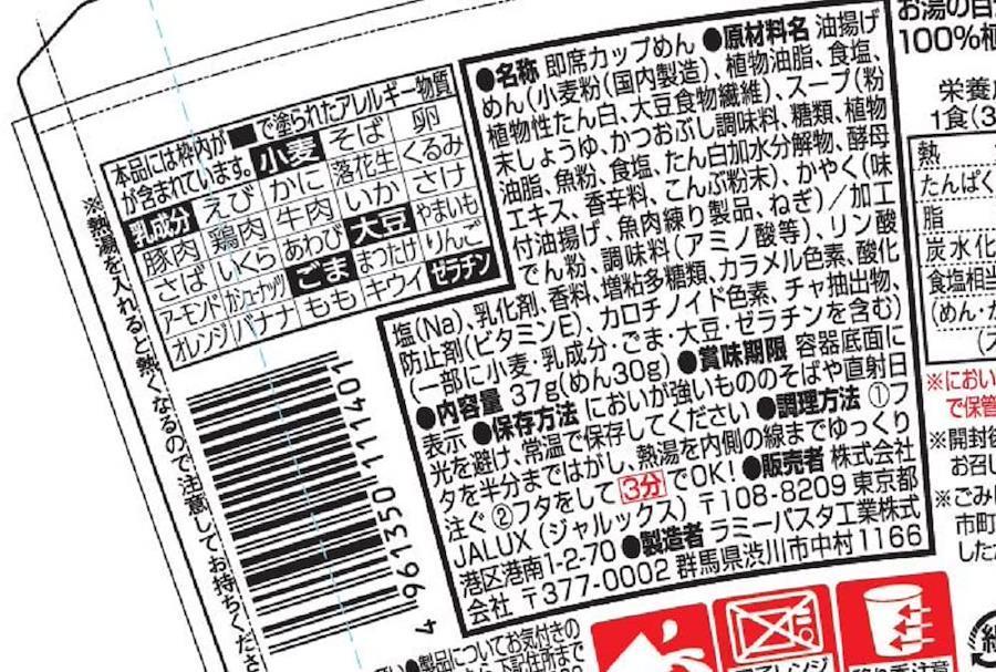 商品紹介 麺:気圧の関係でお湯の沸点が80~85度となる飛行中の航空機内にて使用することを目的に戻りやすく、のびにくい特性の麺を開発、使用しています。その為、ポットのお湯でも再沸騰しなくても大丈夫。注いで3分で出来上がる。100%植物油を使用したフライ麺です。 スープ:利尻昆布だしを利かせた関西風醤油味。 具材:丸大豆100%の油揚げとネギ、さらには飛行機の絵柄のかわいらしいオリジナルかまぼこが入っておりますので、見た目も楽しんでいただけます。合成保存料、着色料とも一切使用しておりません。 パッケージ:JAL国際線の副食として召し上がっていただくことから、“飛行機"の絵柄で、空のイメージが感じられるかわいらしいパッケージデザイン。おやつや夜食、ランチに添えて、ちょうど良いコンパクトサイズになっています。 原材料・成分 油揚げめん、スープ、かやく