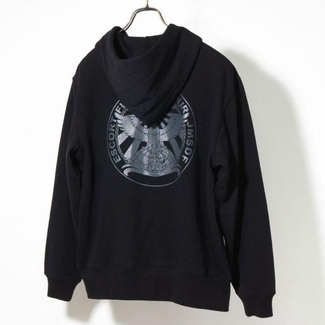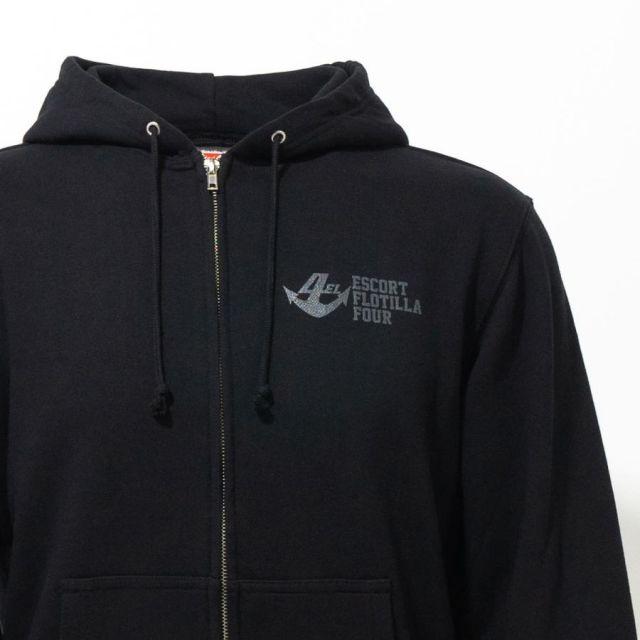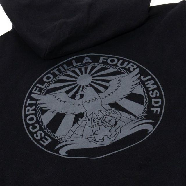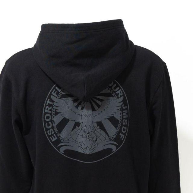 商品名:自衛隊グッズ ジップアップパーカー ( 海上自衛隊 第4護衛隊群司令部 ) 海上自衛隊グッズ 和風 和柄 八咫烏 メンズ プルオーバー 裏パイル『第4護衛隊群について』第4護衛隊群は広島県呉市に所在し、同市を拠点とする第4護衛隊と、長崎県佐世保市を拠点とする第8護衛隊により編成されています。●第4護衛隊(呉)…いなづま・さみだれ・さざなみ・かが●第8護衛隊(佐世保)…きりしま・すずつきロゴは第4護衛隊群司令部が呉に転籍となった際、呉の地に馴染みの深い八咫烏をモチーフに、大きな翼で日本を守ることをイメージしてデザインされたものです。裏地は伸縮性と吸水性のある裏パイル(裏毛)仕様。ガシガシ使えるタフな生地厚でありながらも、肌触りがよくやわらかい着心地。季節の変わりめの重ね着や室内着など、さまざまなシーンで使いたい1着です。フード部分は二重になっていて、程よいボリューム感を与えてくれます。<カラー>ブラック<サイズ>S:胸囲104・着丈63・肩幅44・袖丈56M:胸囲110・着丈67・肩幅48・袖丈60L:胸囲116・着丈71・肩幅52・袖丈61LL:胸囲126・着丈76・肩幅55・袖丈623L:胸囲136・着丈81・肩幅58・袖丈63<素材> 綿100%・裏パイル(10oz)商品番号:g1875s
