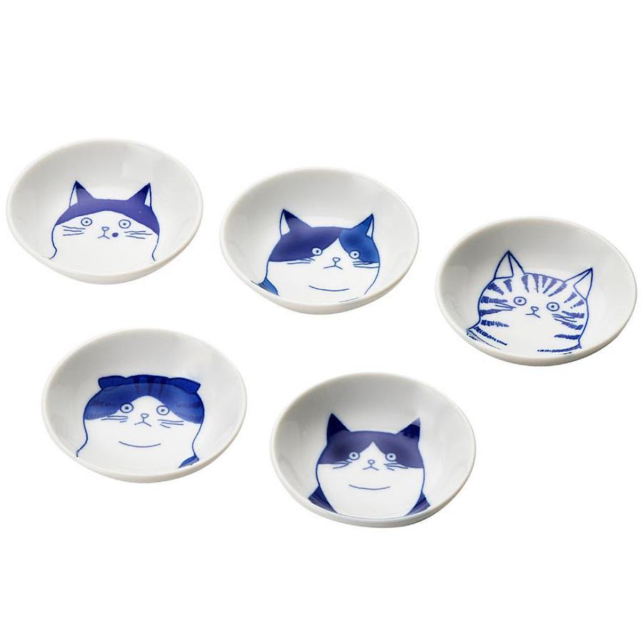 This set features five small Japanese mini plates, ideal for cat lovers. Each dish is adorned with a unique hand-drawn style blue (Aizome) cat face. The plates are versatile and can be used for serving soy sauce, dipping sauces, condiments, appetizers, or small snacks.