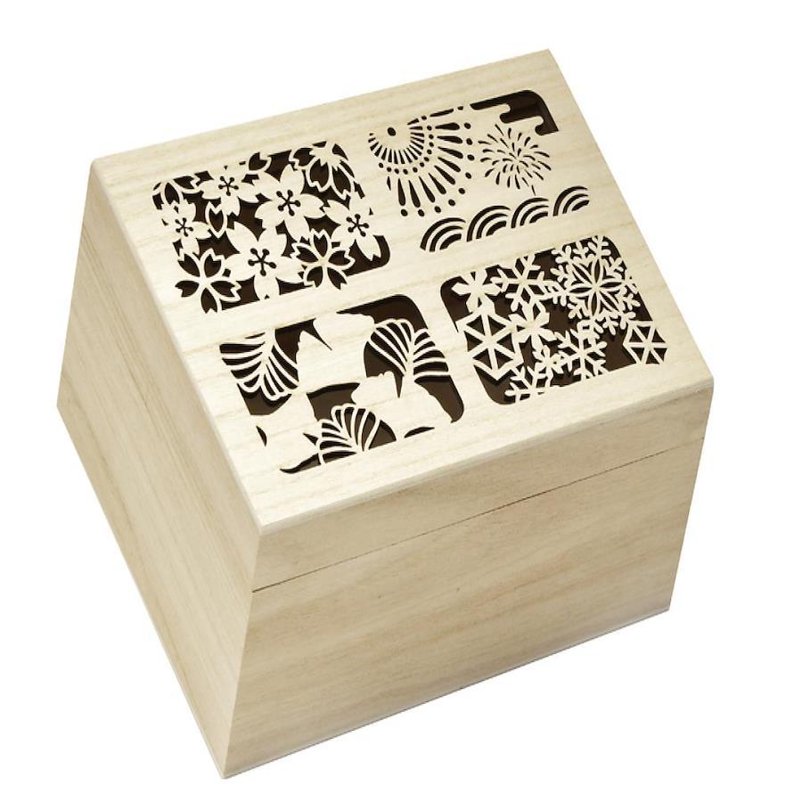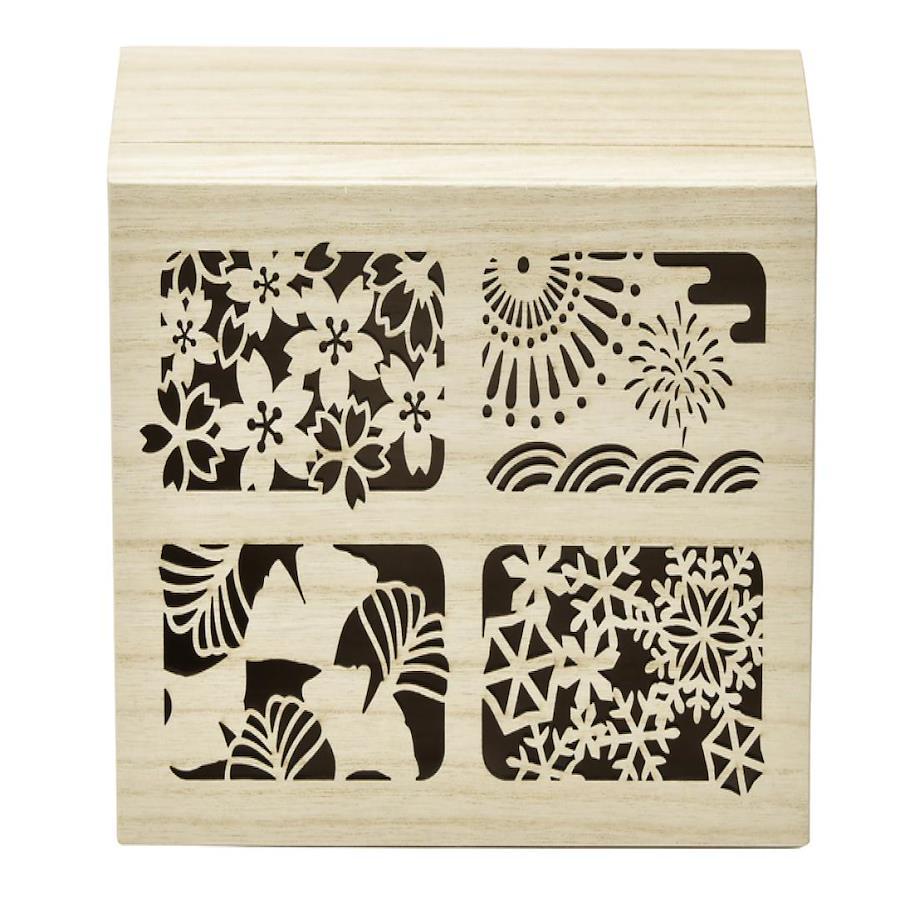 Engraved Wooden Gift Box: A custom-made box with beautiful Japanese motif cut-outs (Cherry blossoms, Fireworks, Waves, and Snowflakes), ready for gifting.