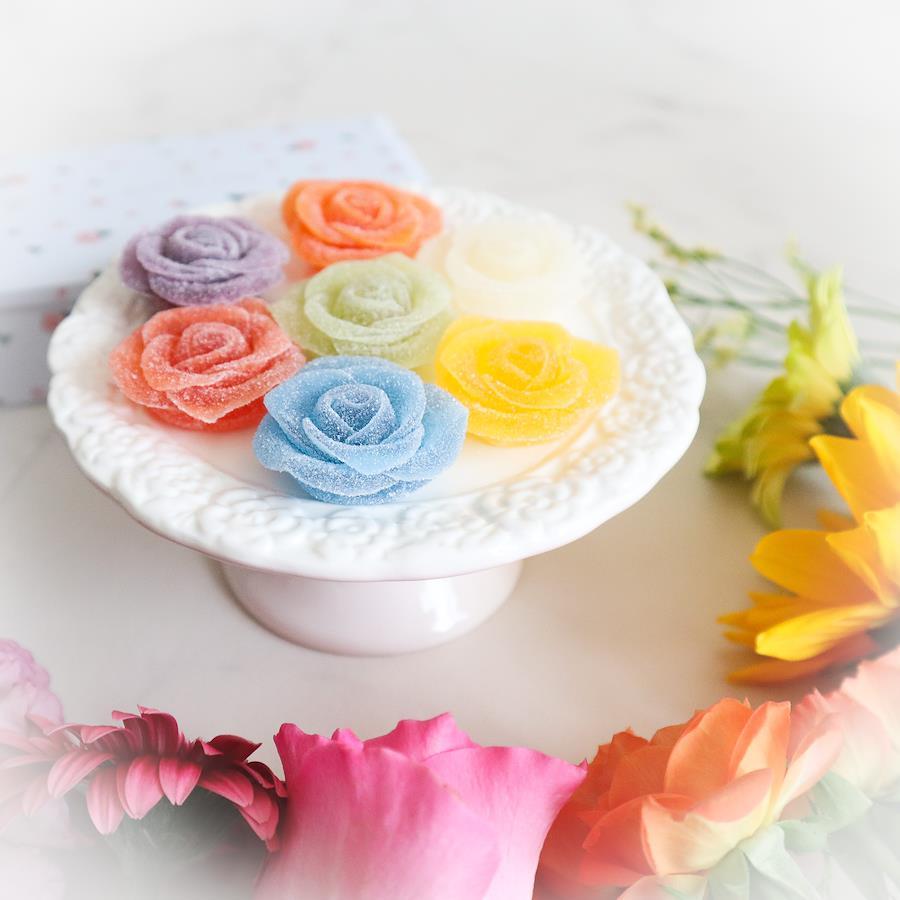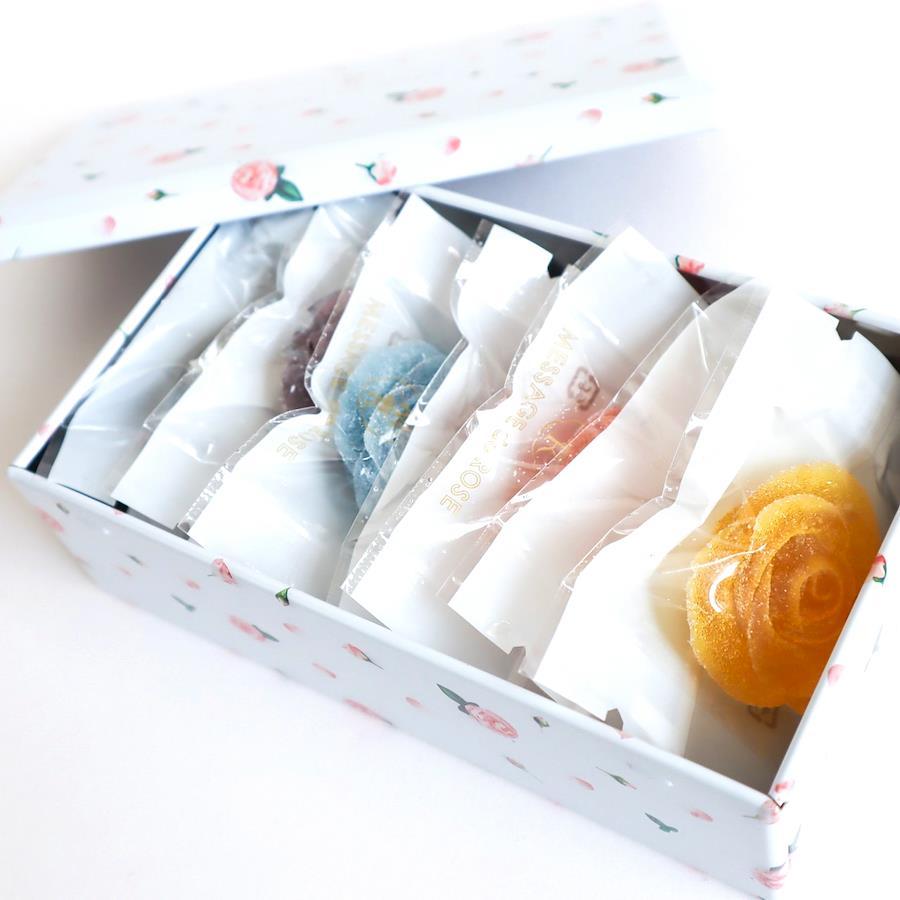 This enchanting gift box is filled with seven jewel‑like, rose‑shaped gummy candies nestled in a charming little rose tin. Each piece is crafted by artisans to recreate the layered petals of a real rose, and the translucent colours shine like precious gems. Open the lid and a fresh, fruity aroma wafts out, while the rich, lightly sweet flavour of real fruit juice spreads delicately in your mouth.