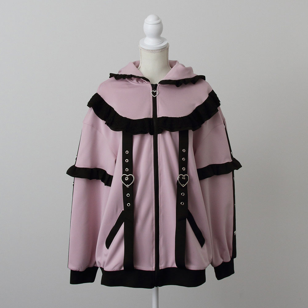 カラー展開豊富♪可愛すぎるジャージパーカーワンピース登場【デザイン】少し大きめのシルエットとなっております。身頃部分はベルトが付いた仕様になっております。袖横にはハートスタッズがついております。フリルやかわいいレースがたっぷりと装飾されているので映えます。カラーはかわいい6色展開と豊富でお気に入りのカラーをお探しください。羽織りとしてはもちろん、ファスナーを閉めればワンピースとしても大活躍のアイテムです!【素材】さらっとした丁度良い厚さのジャージ生地を使用しています。【コーディネート】普段のかわいいコーディネートにだぼっと羽織ってコーデしてみてください♪カラーによってサブカル地雷にも天使界隈にもなれます。《透け感》なし 《生地の厚さ》普通 《裏地》なし 《伸縮性》ややあり《生産国》中国