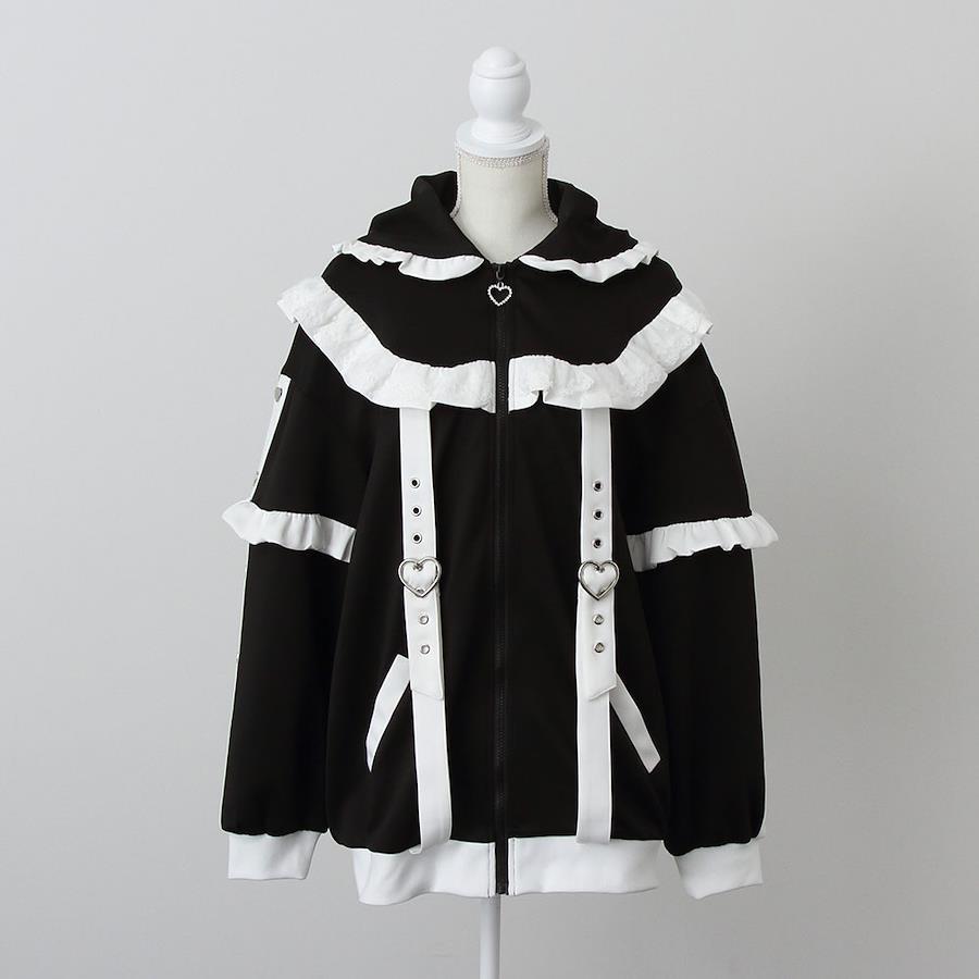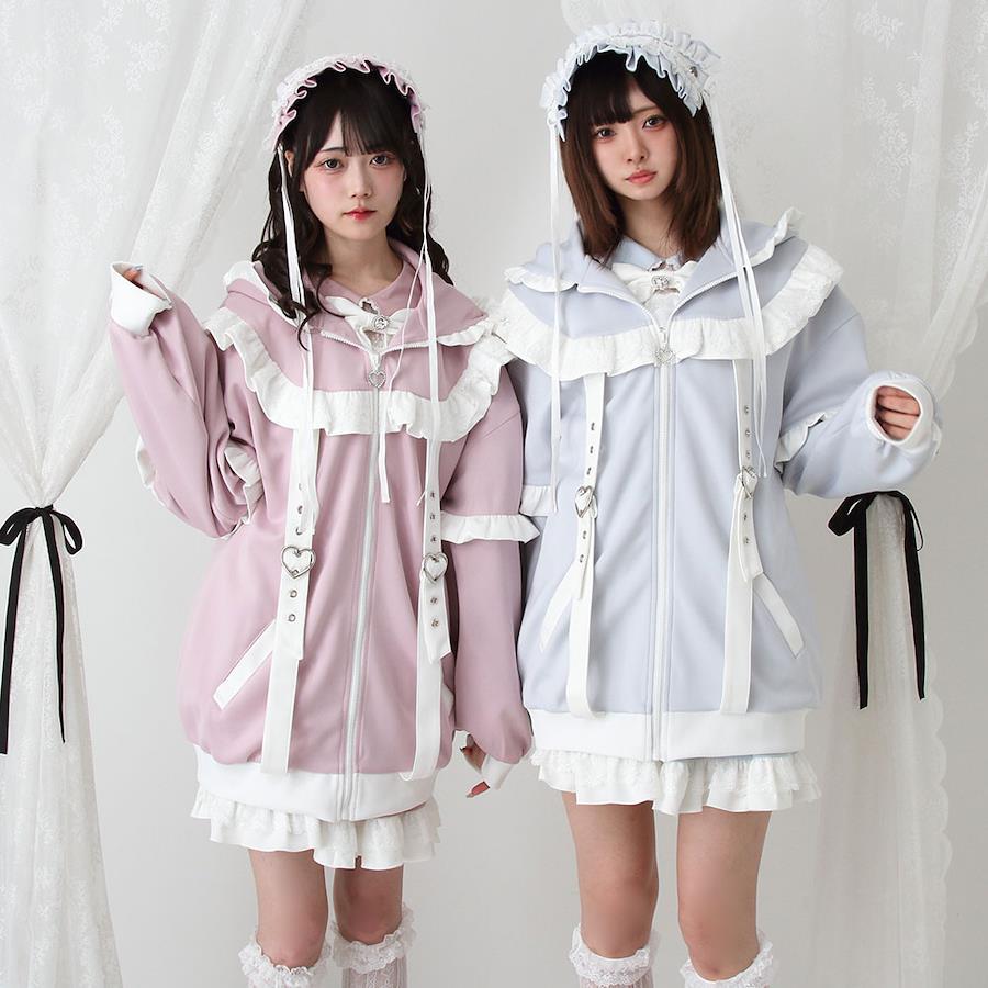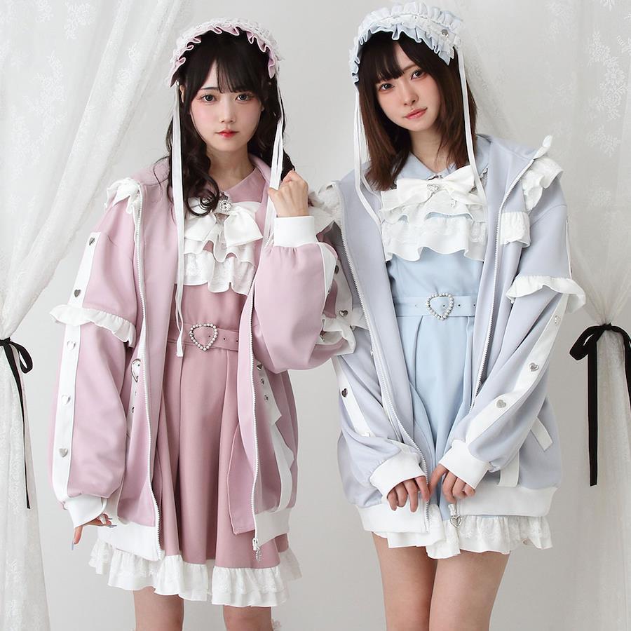 カラー展開豊富♪可愛すぎるジャージパーカーワンピース登場【デザイン】少し大きめのシルエットとなっております。身頃部分はベルトが付いた仕様になっております。袖横にはハートスタッズがついております。フリルやかわいいレースがたっぷりと装飾されているので映えます。カラーはかわいい6色展開と豊富でお気に入りのカラーをお探しください。羽織りとしてはもちろん、ファスナーを閉めればワンピースとしても大活躍のアイテムです!【素材】さらっとした丁度良い厚さのジャージ生地を使用しています。【コーディネート】普段のかわいいコーディネートにだぼっと羽織ってコーデしてみてください♪カラーによってサブカル地雷にも天使界隈にもなれます。《透け感》なし 《生地の厚さ》普通 《裏地》なし 《伸縮性》ややあり《生産国》中国