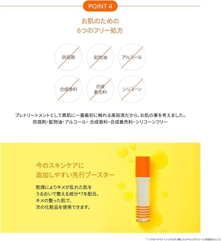 「成分」水、ビスグリセリルアスコルビン酸、グリセリン、BG、1,2-ヘキサンジオール、クエン酸Na、ラウリン酸ポリグリセリル-10、クエン酸、ピロ亜硫酸Na、カラメル、イソステアリルアスコルビルリン酸2Na、トコフェリルリン酸Na、パルミチン酸アスコルビルリン酸3Na、シクロヘキサン-1,4-ジカルボン酸ビスエトキシジグリコール、トコフェロール