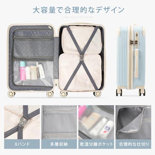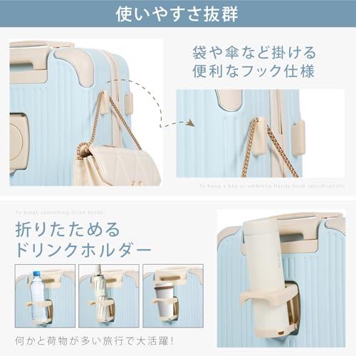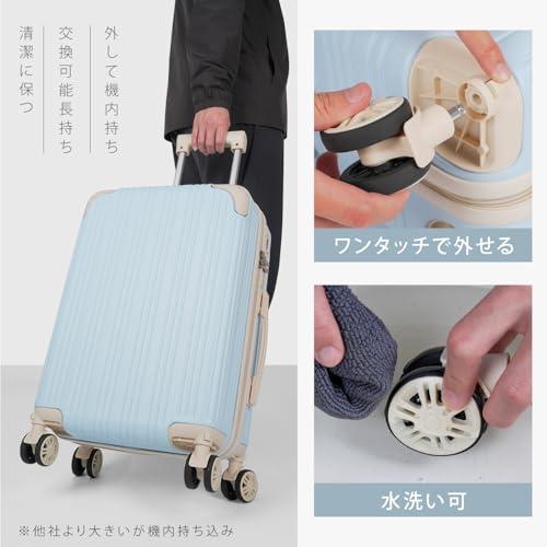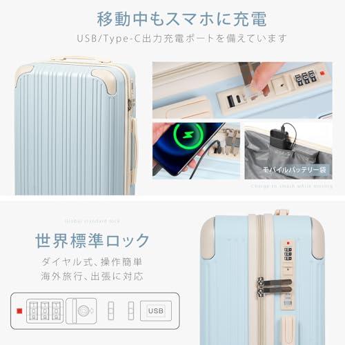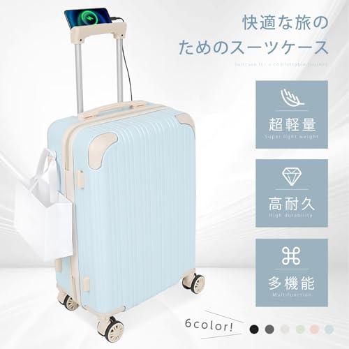 【キャスター外せる】最新バージョンのキャスターはボタンを押すだけの「ワンタッチ交換タイプ」なので、玄関で取り外せば自宅の床を汚さず気持ちよく室内保管できます。摩耗・破損しても、新しいキャスターに取り替えれば永くお使いいただけます。そして、スーツケースを持って飛行機を乗る前、キャスターを取り外せばそ総合サイズも控えて、機内持ち込みもOK、高弾性TPE衝撃軽減素材キャスターの軸部分に内蔵されたサスペンションが凹凸路面の振動を吸収、不快な走行音を驚くほどに抑え、段差もスイスイ乗り越えます。容量:63L 重量:3.4KG サイズ:43*23*66cm 【ABSとPC&耐衝撃】新型きキャリーケースの表面はPC(ポリカーボネート)を使用、そして、傷が目立ちにくいマットエンボス加工、傷つきにくく、高耐衝撃性を持ち、高弾性で、変形しにくいです。中央は高品質ABS樹脂を使用、防水性、耐摩耗性を備えています。軽くて丈夫な素材で、外部衝撃に強く、長く使えます。コーナーパッド付き、耐衝撃とファッション性両立です。 【多段階キャリバー&最新版キャスター】キャリーバッグは超軽量アルミ製キャリバーを採用、頑丈で揺れ動きにくく、キャリバーの高さを自由に調節できます。レバーの上部にはスマホルダーが付いているので、フライトの待ち時間に両手が自由になり、外出先でもリラックスできます。高弾性TPE衝撃軽減素材&360°独立回転できるダブルキャスターを採用し、スムーズな動きと安定した走行が可能となります。ストッパー機能付き、坂道の途中や電車の揺れでも安定に止まります。 【ダイヤルロック&Type-C&USB充電】鍵には世界基準のダイヤルロックを使用しています。外出がより安全です。また、充電ポートは従来のUSBの上に、Type-Cも設定しており、スマホやタブレットを手軽に充電でき、旅行中のバッテリー不安を解消します。キャリーケース内装にもモバイルバッテリー専用袋付属するので、モバイルバッテリーと荷物分けて安心です。 【カップホルダー&モノ掛けフック】裏側のホルダーは水筒、カップ、傘などを掛け荷物が多くなる旅には大変便利です。モノ掛けフックでお買い物された袋やバッグの整理が楽になります。内装に再生素材を使用しました。高品質裏地素材と両面のXバンド合わせて、荷物をスッキリ収納できます。便利な仕分けポケットで荷物を衛生的に整理でき、乾湿を分けて収納できます。インテリアは合理的な収納仕切りで、行きも帰りも楽になります。滑りにくいソフトハンドルで長い時間の手提げでも手は疲れません。 【安心保証】製品に関するご相談やご不明な点などは、カスタマーサービスにお問い合わせください。受付時間:7X24時間。