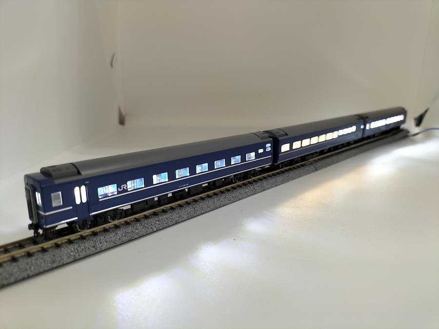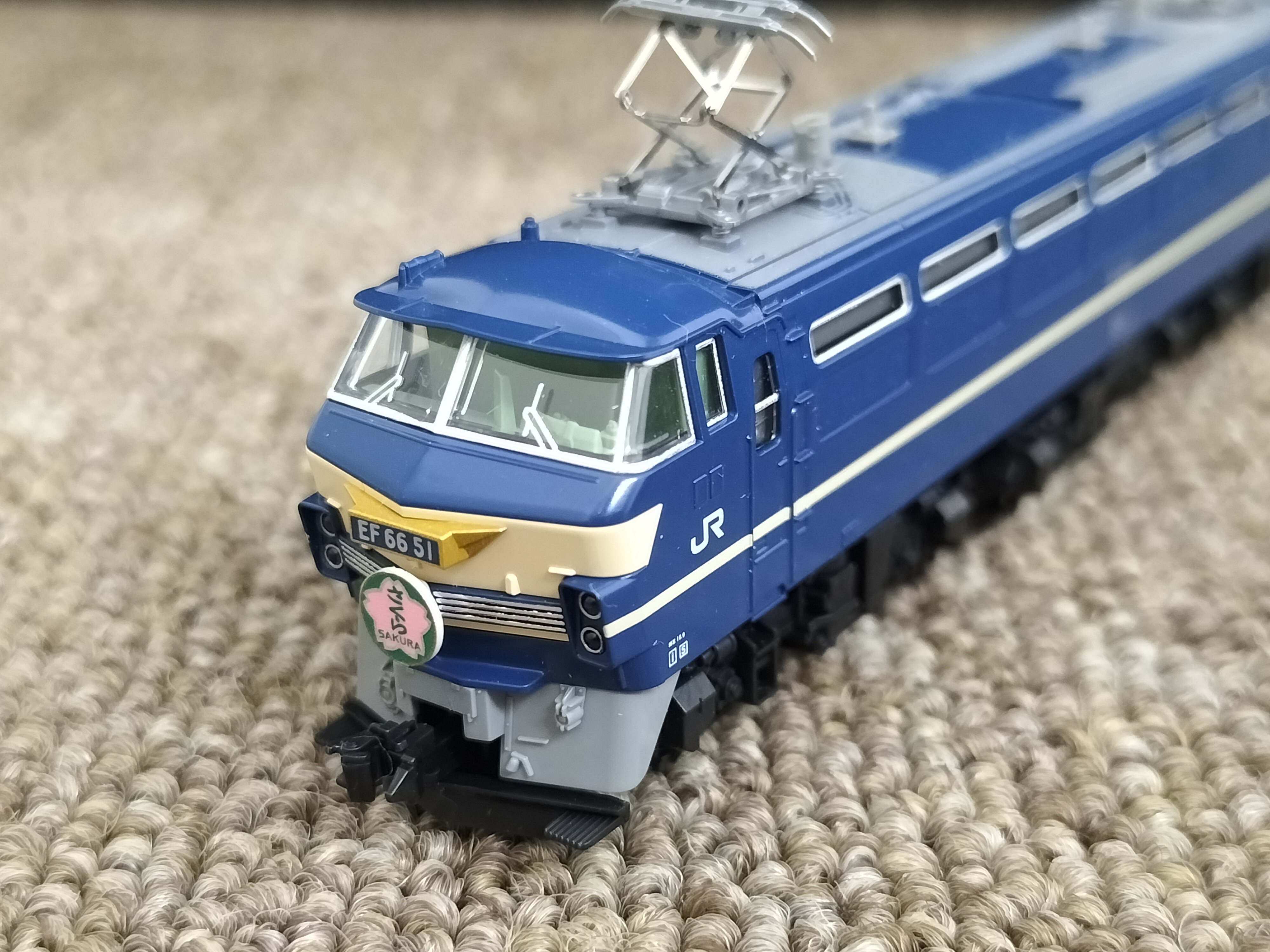 動作OKEF66セット付属品欠品。あさかぜヘッドマーク欠品、代わりにさくらのヘッドマーク取付済EF66ブルートレインセット、はやぶさセットの24系25形100番台客車全車BMTNカプラー密自連に交換済室内灯装備。社外品です