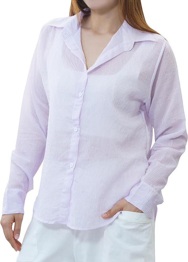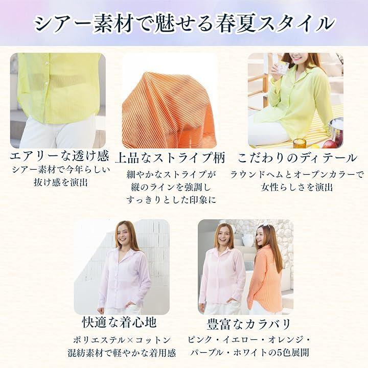 [5つの魅力ポイント] 1. エアリーな透け感:シアー素材で抜け感を演出 2. 上品なストライプ柄:細やかなストライプが縦のラインを強調し、すっきりとした印象に 3. こだわりのディテール:ラウンドヘムとオープンカラーで女性らしさを演出 4. 快適な着心地:ポリエステルxコットン混紡素材で軽やかな着用感 5. 豊富なカラバリ:様々なコーデに合わせられる5色展開