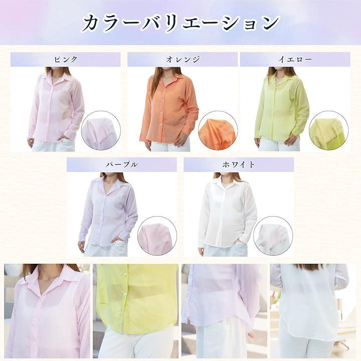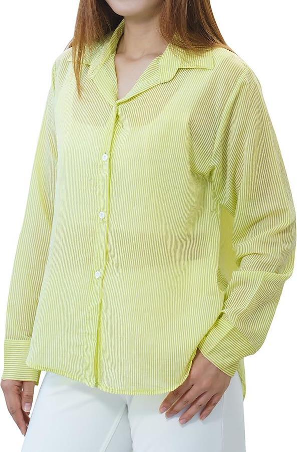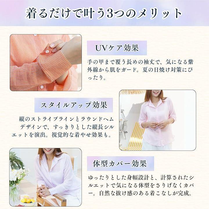 [5つの魅力ポイント] 1. エアリーな透け感:シアー素材で抜け感を演出 2. 上品なストライプ柄:細やかなストライプが縦のラインを強調し、すっきりとした印象に 3. こだわりのディテール:ラウンドヘムとオープンカラーで女性らしさを演出 4. 快適な着心地:ポリエステルxコットン混紡素材で軽やかな着用感 5. 豊富なカラバリ:様々なコーデに合わせられる5色展開