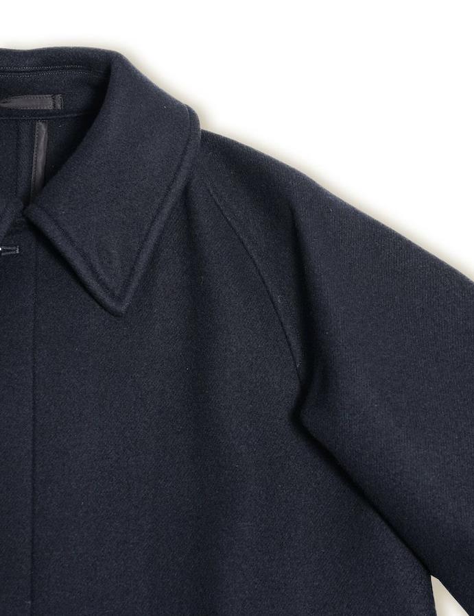 極細ウール繊維、16.5マイクロンのSuper140’sを使用して高密度に織り上げたリバース・ダブルクロスメルトンです。 適度なハリコシがあり軽量で充分な柔らかさと艶感が特徴の二重織メルトンです。 ブランド定番のコートです。