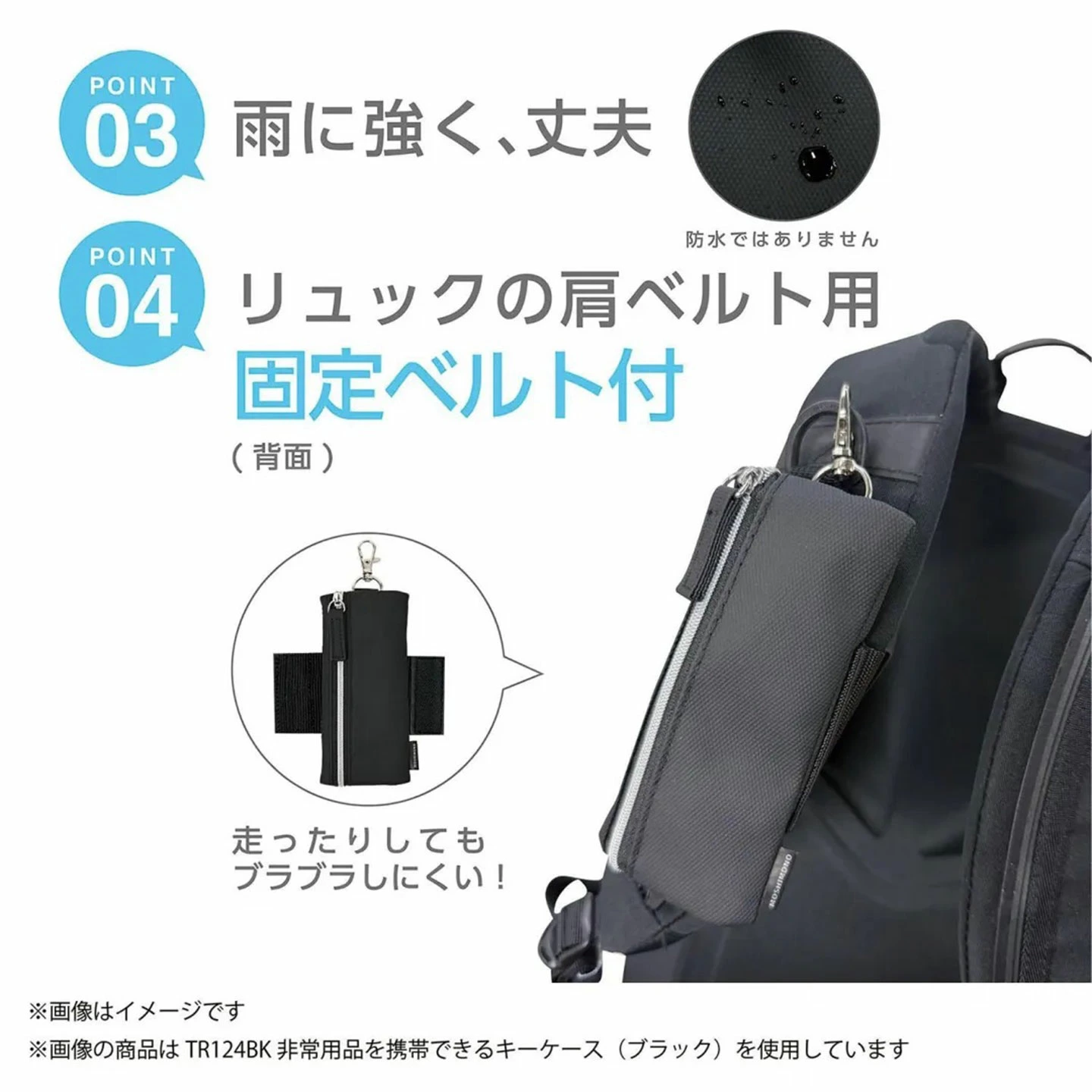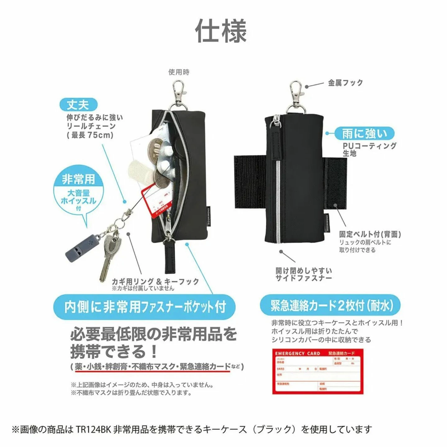 【非常用品を携帯できるキーケース】薬、小銭、絆創膏など非常用品をまとめて携帯できるキーケース。内側のファスナーポケットにもしもの時に備えて小物を収納できます◎非常時に役立つホイッスル、緊急連絡カード付き。長く伸びるリールで鍵の紛失も防止。背面の固定ベルトでリュックの肩ベルトに取り付ければ走ったりしてもブラブラせずに持ち歩けます◎通勤・通学など外出時の万が一への備えにおすすめです。