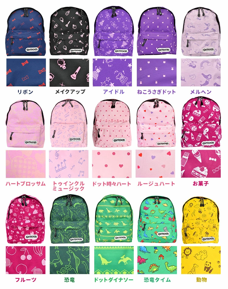 大人気のoutdoorからキッズのデイパックが新入荷!柄は子供たちが大好きなモチーフ&カラーの29パターン。キャラものじゃ無いのに子どもらしくて可愛い!前でハーネスを止められるので、やんちゃなキッズでもずれ落ちることなく安心♪薄く軽いけれどとっても丈夫な素材で、長く使って頂けます☆身長100cm位から140cmくらいまで幅広くお勧めできるサイズ。プレゼントとしても大変喜ばれています!