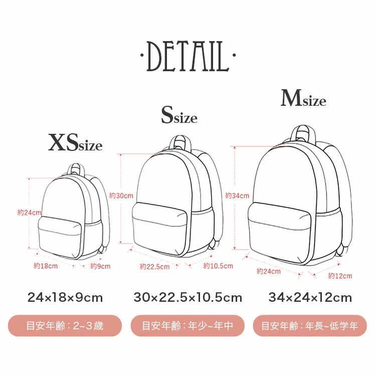 入園・入学準備にピッタリのフリルデイパック。 ヨチヨチ歩きの子にはXSサイズ、就学前のお子様にはSサイズ、 小学生のお子様にはMサイズがおすすめ!