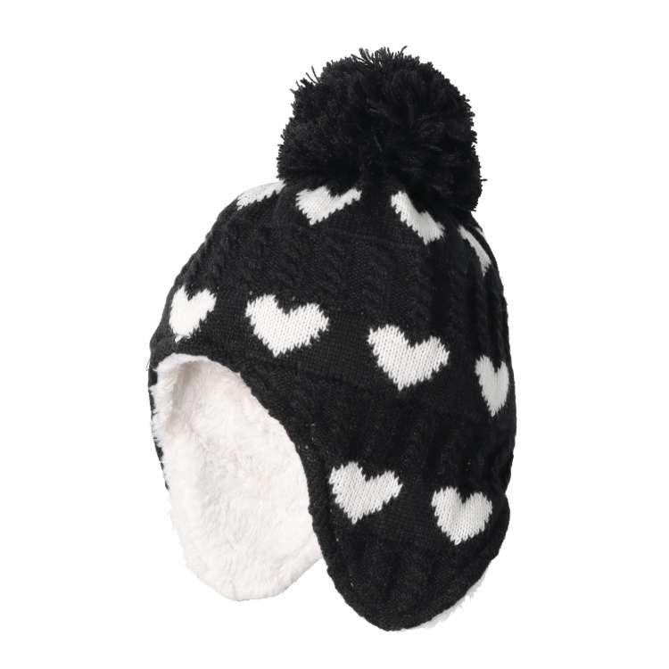 女の子らしいハート柄のアクリル素材のニット帽、帽子。耳も隠れるデザインに裏はボアで暖かく、可愛いだけでなく実用的。頭のてっぺんの大きなぼん天もポイント!同じ柄のスヌード、ネックウォーマー(B63808)、手袋(B63807)と合わせて着るのもオススメ!【アイテム】雑貨 カジュアル お洒落 オシャレ かっこいい かわいい 可愛い 普段着 デイリーウェア お出かけ 子ども こども 女児 女の子 ガールズ キッズ ベビーサイズ トドラーサイズ 幼稚園 保育園 小学校 通園 通学 小学生 遠足 旅行 2024年秋冬物新作 丸高衣料 小物 クリスマスプレゼント ギフト 誕生日 キッズフォーレ ブラック 黒色 オフホワイト 白色