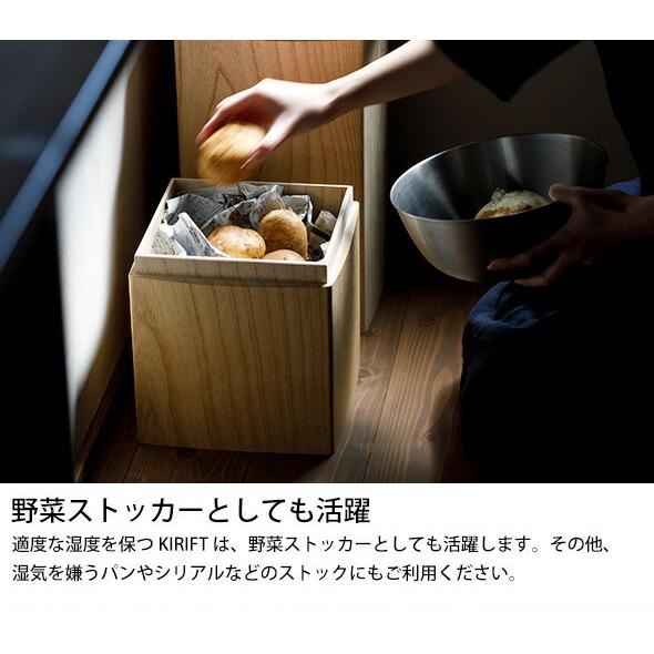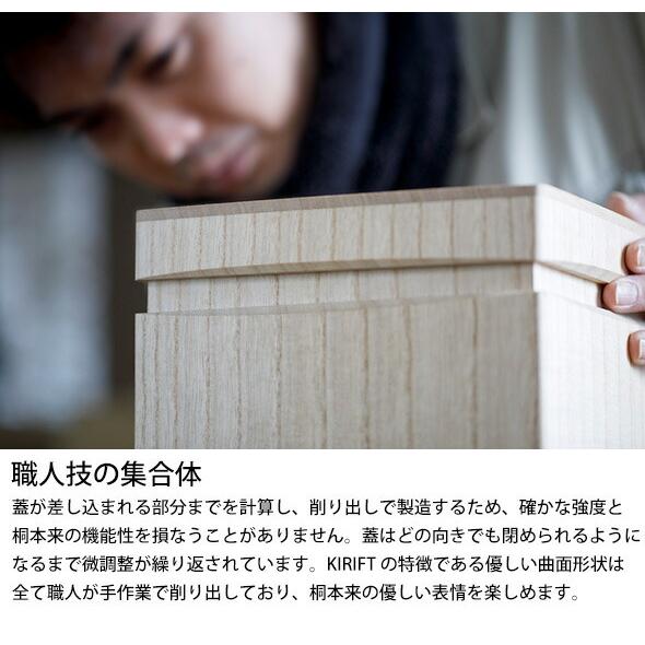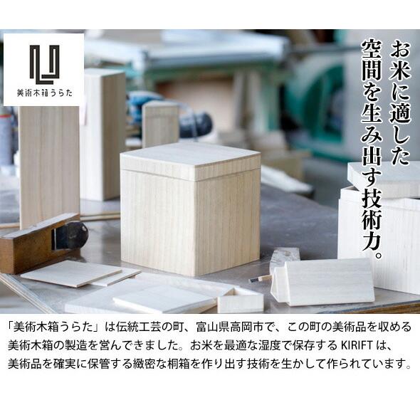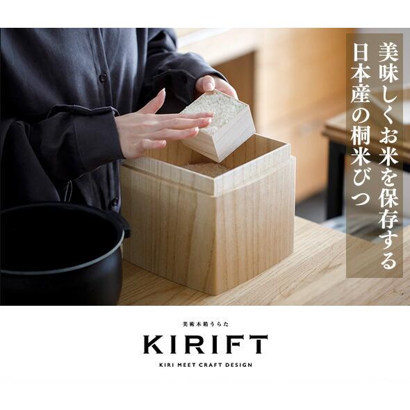 KIRIFTの焼桐ライスストッカーは、お米の保存に適した天然素材「桐」を使用したこだわりの米びつです。桐は昔から湿気を調整する特性を持ち、お米の品質を保ちながら長期間保存できる素材として知られています。