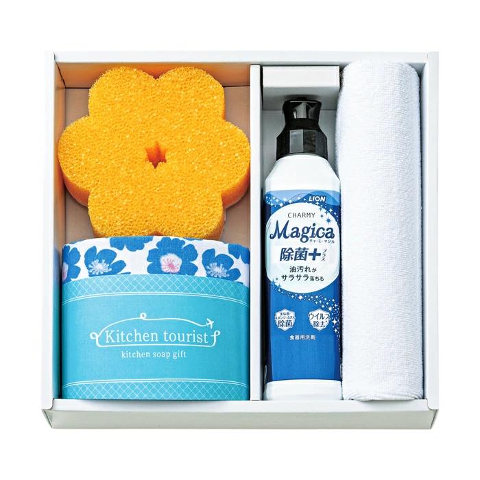 チャーミーマジカ 除菌プラス220ml、スポンジ、マイクロファイバークロス(約25×25cm)、プリント手ぬぐいハンカチ(約28×34cm)×各1