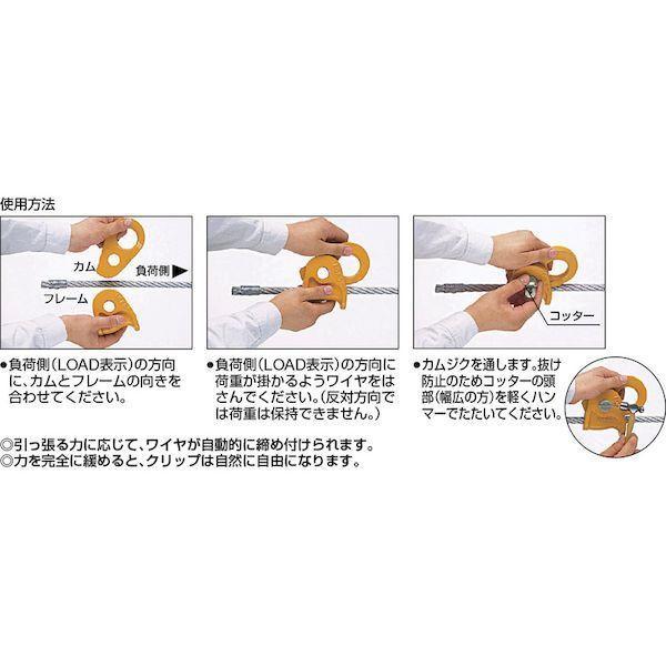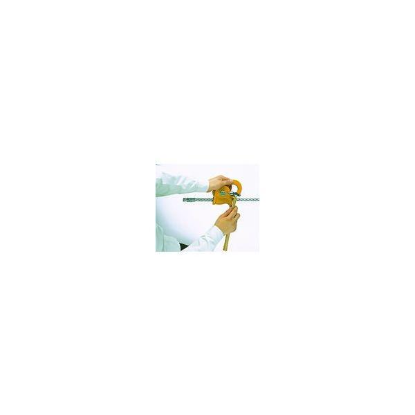 ●レバーブロック、チェーンブロックなどとワイヤロープとの併用作業用に開発されたワイヤロープ専用固定器具です。