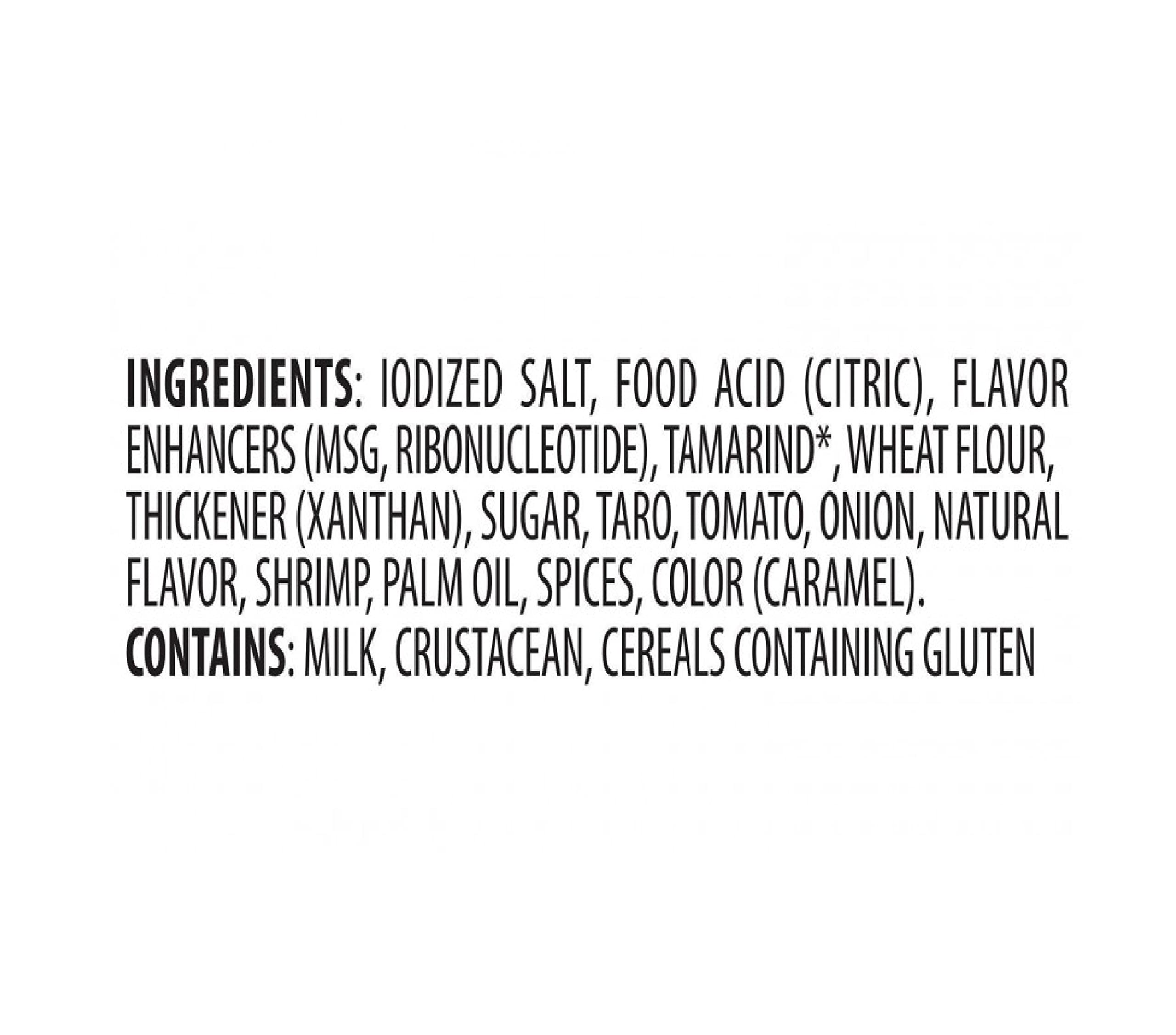 タマリンド、トマト、小エビ、玉ねぎ、タロイモ、タマリンドエキス、植物油、食塩、砂糖、香辛料、調味料(アミノ酸等)、クエン酸、アスコルビン酸、香料